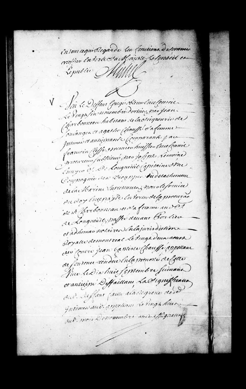 Appel mis à néant de la sentence rendue en la Prévôté de Québec, le 18 septembre 1736, dans la cause entre Jean Charbonneau, habitant de la seigneurie de Soulanges, et Agathe Chaussée, sa femme, contre Jean-Baptiste Chaussée, 10 décembre 1736, Archives nationales à Québec, Fonds Conseil souverain, (03Q,TP1,S28,P18418).