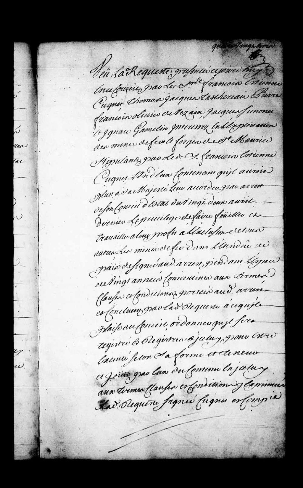 Arrêt qui ordonne d'enregistrer, dans les registres du Conseil, l'arrêt du Conseil d'État de Sa Majesté, daté du 22 avril 1737, qui accorde le privilège à François-Étienne Cugnet, Thomas-Jacques Taschereau, Pierre-François-Olivier de Vezain, Jacques Simonet et Ignace Hamelin de fouiller et travailler à leur profit les mines de fer dans l'étendue du pays désignée au dit arrêt pendant l'espace de vingt années consécutives, 26 août 1737, Archives nationales à Québec, Fonds Conseil souverain, (03Q,TP1,S28,P18546).