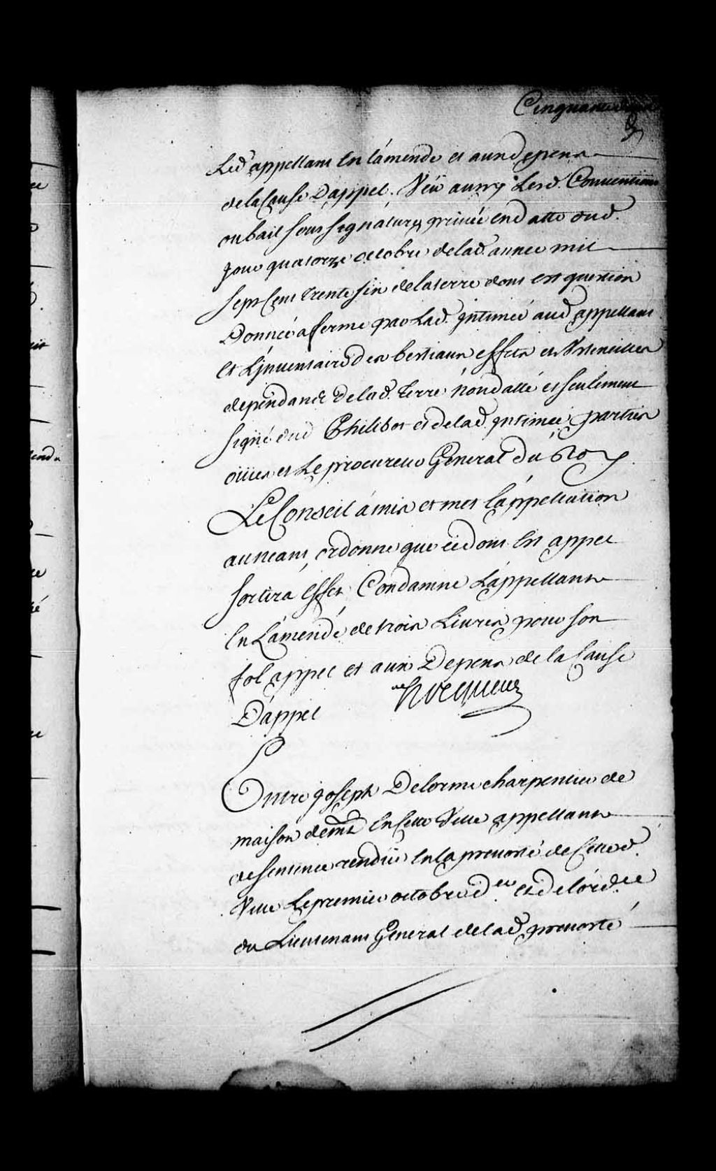Appel mis à néant de la sentence rendue en la Prévôté de Québec, le 1er octobre 1737, dans la cause entre Joseph Simon Delorme, charpentier de maison de Québec, contre Antoine Mouffle, négociant en la ville de Beauvais, stipulant pour lui Charles Berthelot (son procureur), négociant de Québec. Le Conseil condamne l'intimé (Antoine Mouffle) à payer à l'appelant (Joseph Simon Delorme) le surplus de ce qu'il peut lui devoir pour la grange en question et aux dépens des causes principale et d'appel, 18 novembre 1737, Archives nationales à Québec, Fonds Conseil souverain, (03Q,TP1,S28,P18588).