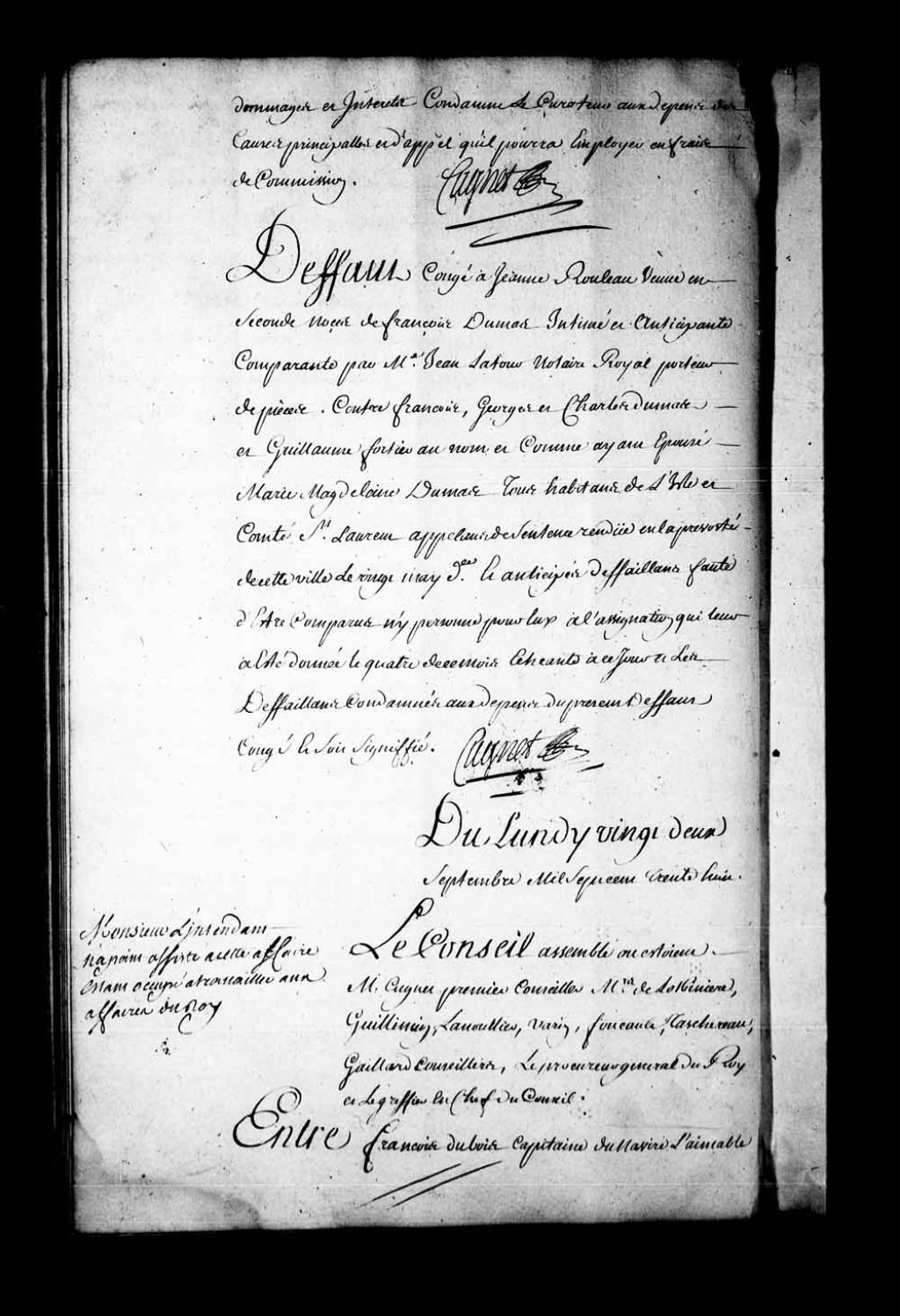 Appel mis à néant de la sentence rendue en l'Amirauté de Québec, le 17 septembre 1738, dans l'affaire entre François Dubois, capitaine du navire l'Aimable Anne, contre Jean Liquart, négociant à Québec. Dubois est condamné à payer à l'intimé les 54 barriques de vin dont il est question sur le même pied que les 28 barriques remises par lui sous la marque P. G, 22 septembre 1738, Archives nationales à Québec, Fonds Conseil souverain, (03Q,TP1,S28,P18742).