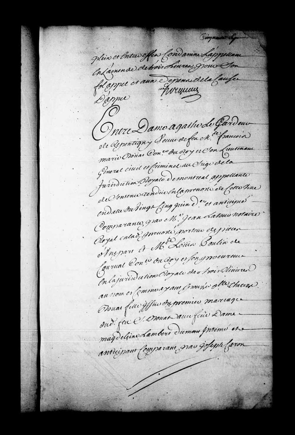 Arrêt qui ordonne qu'il en sera délibéré devant Jean-Baptiste Gaillard, conseiller, dans la cause entre dame Agathe Legardeur de Repentigny, veuve de François-Marie Bouat et appelante de la sentence rendue en la Prévôté de Québec, le 25 juin 1739, contre Louis Poulin de Courval, au nom et comme époux de Thérèse Bouat, fille du premier mariage du sieur Bouat avec Madeleine Lambert Dumont, 3 août 1739, Archives nationales à Québec, Fonds Conseil souverain, (03Q,TP1,S28,P18859).