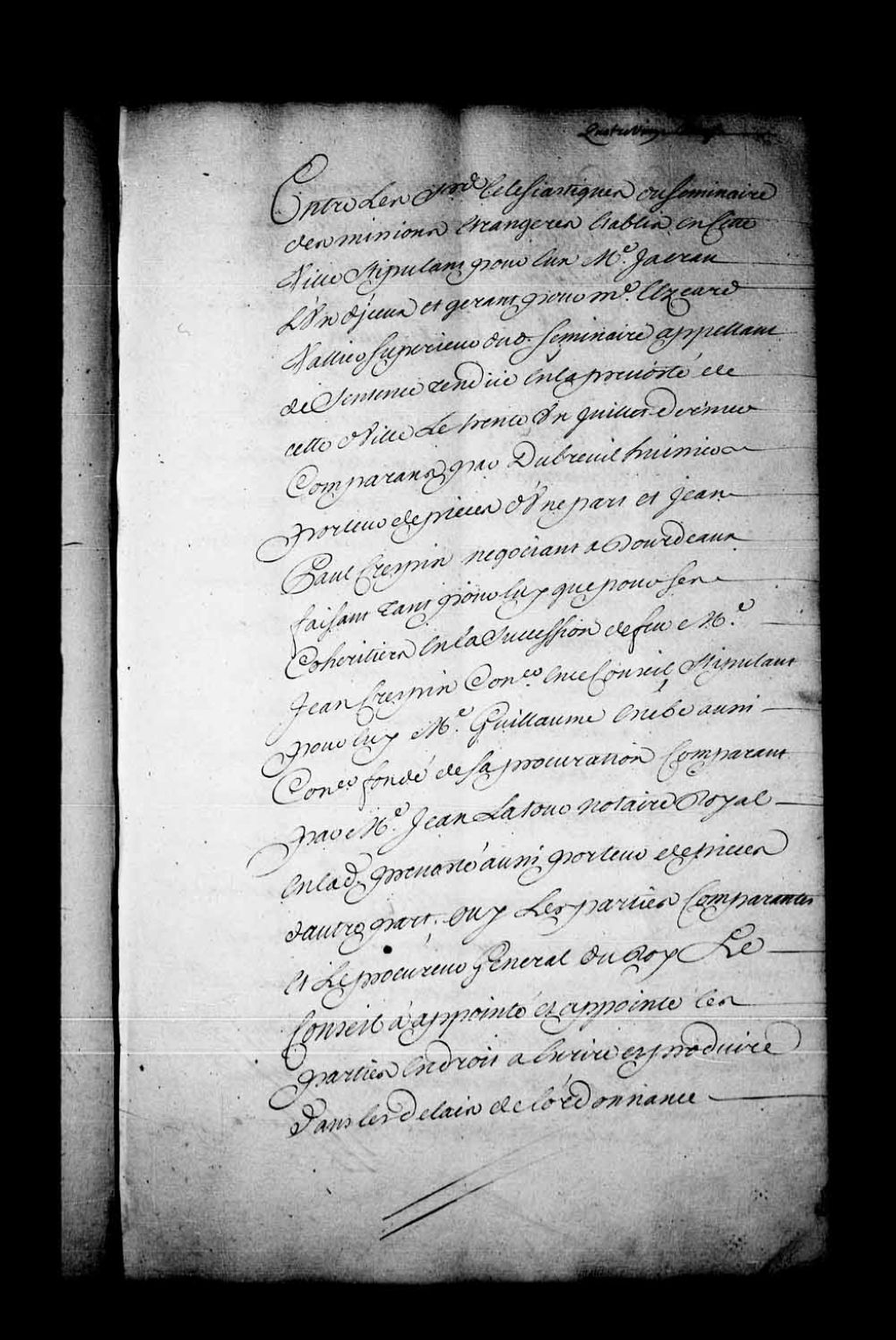 Arrêt qui appointe les parties en droit à écrire et produire, dans les délais de l'ordonnance, devant Jean-Victor Varin, conseiller, dans l'affaire entre les Ecclésiastiques du Séminaire des Missions Étrangères établi à Québec, appelants de la sentence rendue en la Prévôté de Québec, le 31 juillet 1739, contre Jean-Paul Crespin (Crépin), négociant à Bordeaux, faisant tant pour lui que pour ses cohéritiers en la succession de feu Jean Crespin (Crépin), conseiller au Conseil, faisant pour lui Guillaume Estèbe, aussi conseiller, 14 septembre 1739, Archives nationales à Québec, Fonds Conseil souverain, (03Q,TP1,S28,P18871).
