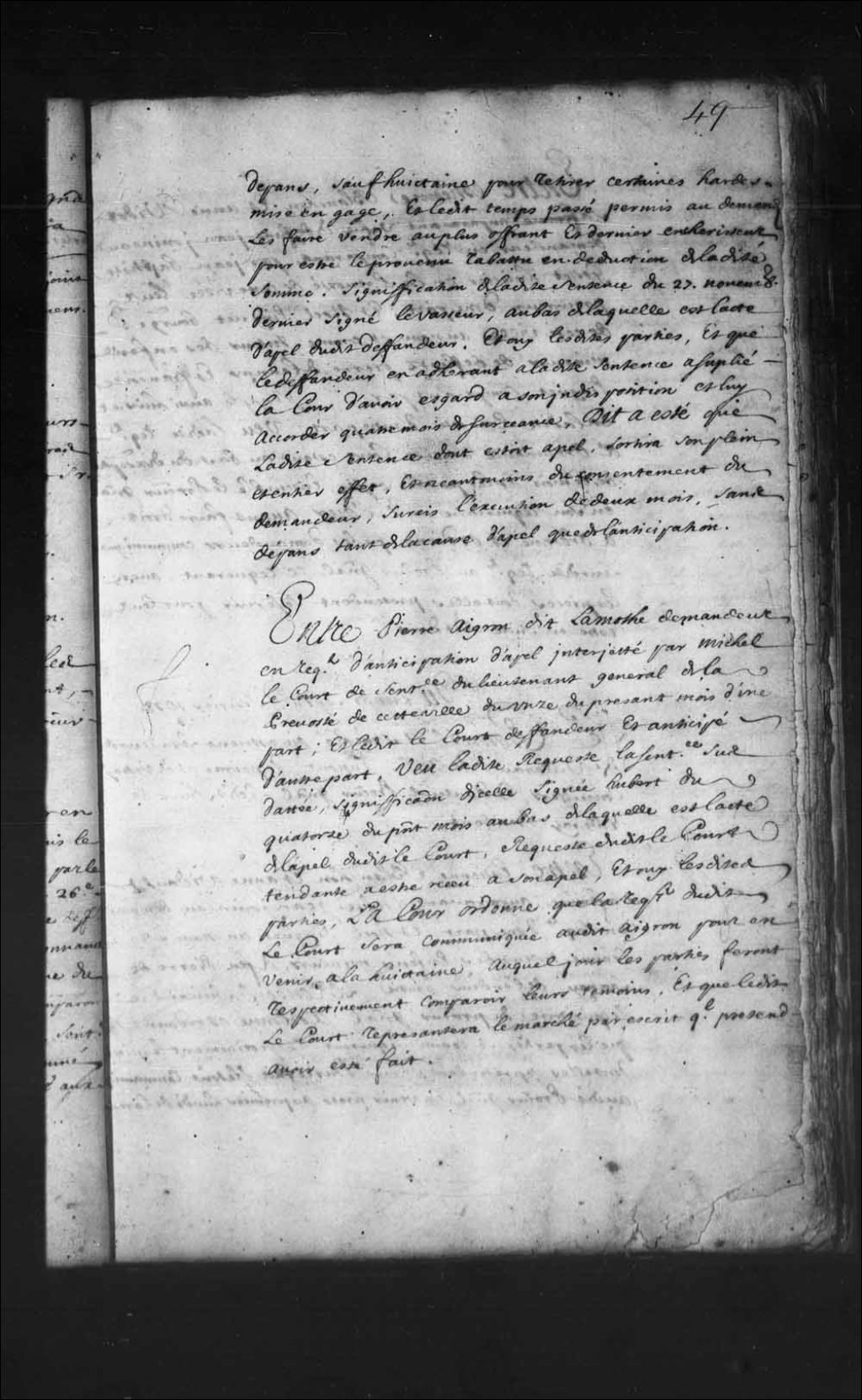 Transcription du texte avec orthographe modernisée : «Entre Pierre AIGRON dit LAMOTHE demandeur en requête d'anticipation d'appel interjeté par Michel LeCourt de sentence du lieutenant général de la prévôté de cette ville du onze du présent mois d'une part, et ledit LECOURT défendeur et anticipé d'autre part, vu ladite requête, la sentence sus-datée, signification d'icelle signée Hubert du quatorze du présent mois, au bas de laquelle est l'acte de l'appel dudit LeCourt, requête dudit LeCourt tendante à être reçu à son appel, et ouï lesdites parties, la Cour ordonne que la requête dudit LeCourt sera communiquée audit Aigron pour en venir à huitaine auquel jour les parties feront respectivement comparaître leurs témoins, et que ledit LeCourt représentera le marché par écrit qu'il prétend avoir été fait. ROUER DE VILLERAY.»