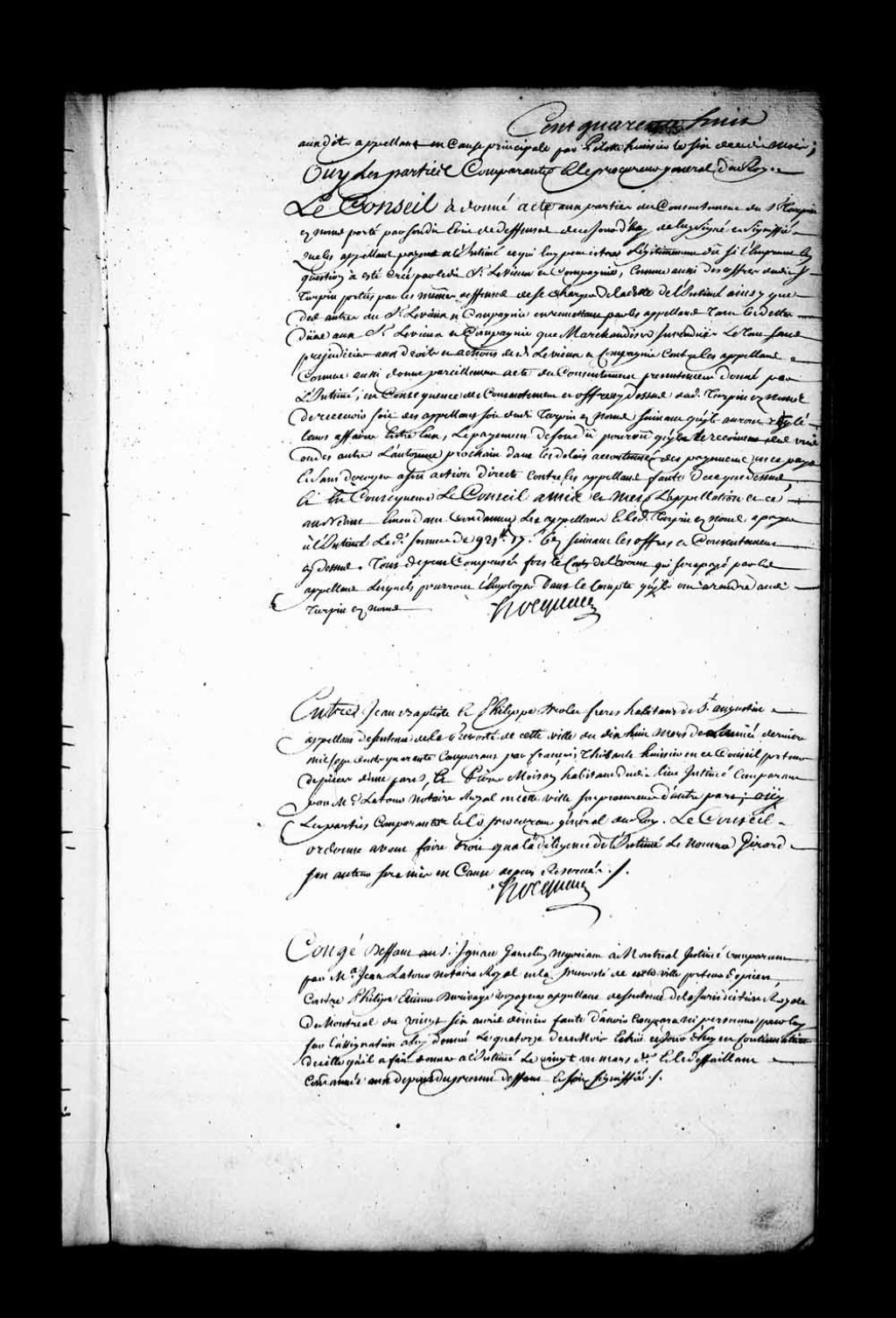 Arrêt qui accorde défaut-congé à Ignace Gamelin, négociant à Montréal, intimé, comparant par Jean Latour, notaire, contre Philippe-Etienne Durivage, voyageur et appelant de la sentence rendue en la Juridiction de Montréal, le 26 avril 1741