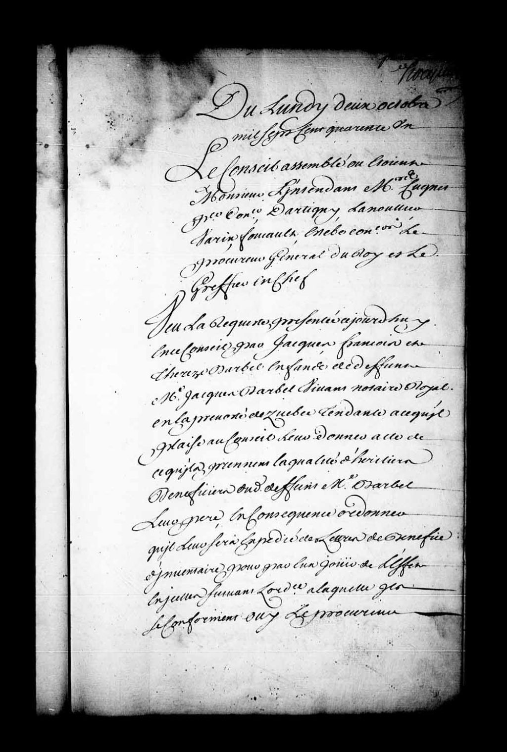 Arrêt qui ordonne, que par le greffier en chef du Conseil, qu'il sera expédié à Jacques-François Barbel et Thérèse Barbel, enfants de feu maître Jacques Barbel, notaire royal en la Prévôté de Québec, des lettres d'héritiers sous bénéfice d'inventaire adressées au lieutenant général de la Prévôté de Québec pour être entérinées, 2 octobre 1741, Archives nationales à Québec, Fonds Conseil souverain, (03Q,TP1,S28,P19161).