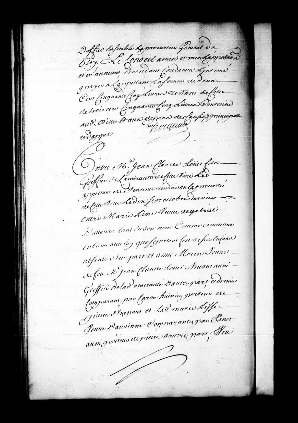 Appel mis à néant de la sentence rendue en la Prévôté de Québec, le 17 octobre 1741, dans la cause entre Jean-Claude Louet fils, greffier de l'Amirauté de Québec, et Marie Lisse, veuve de Gabriel Davainne, tant en son nom comme commune en biens avec lui que se portant fort de ses enfants absents, contre Anne Morin, veuve de Jean-Claude Louet, aussi greffier de l'Amirauté de Québec. Il est ordonné que ce qui est en appel sortira son plein et entier effet. Jean-Claude Louet fils est condamné à l'amende de 3 livres pour son «fol appel» et aux dépens de la cause d'appel, 27 novembre 1741, Archives nationales à Québec, Fonds Conseil souverain, (03Q,TP1,S28,P19191).
