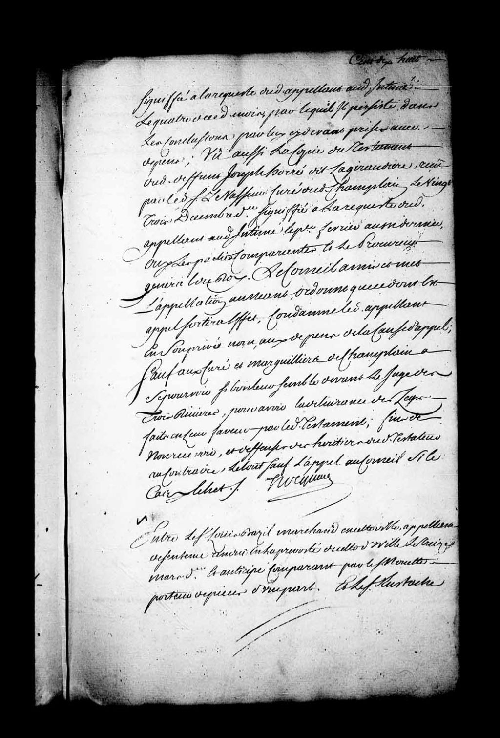 Arrêt qui continue l'audience à quinzaine dans la cause entre Louis Bazil, marchand de Québec et appelant de la sentence rendue en la Prévôté de Québec, le 13 mars 1742, contre Eustache Lanouillier de Boisclerc, grand voyer, 7 mai 1742, Archives nationales à Québec, Fonds Conseil souverain, (03Q,TP1,S28,P19257).