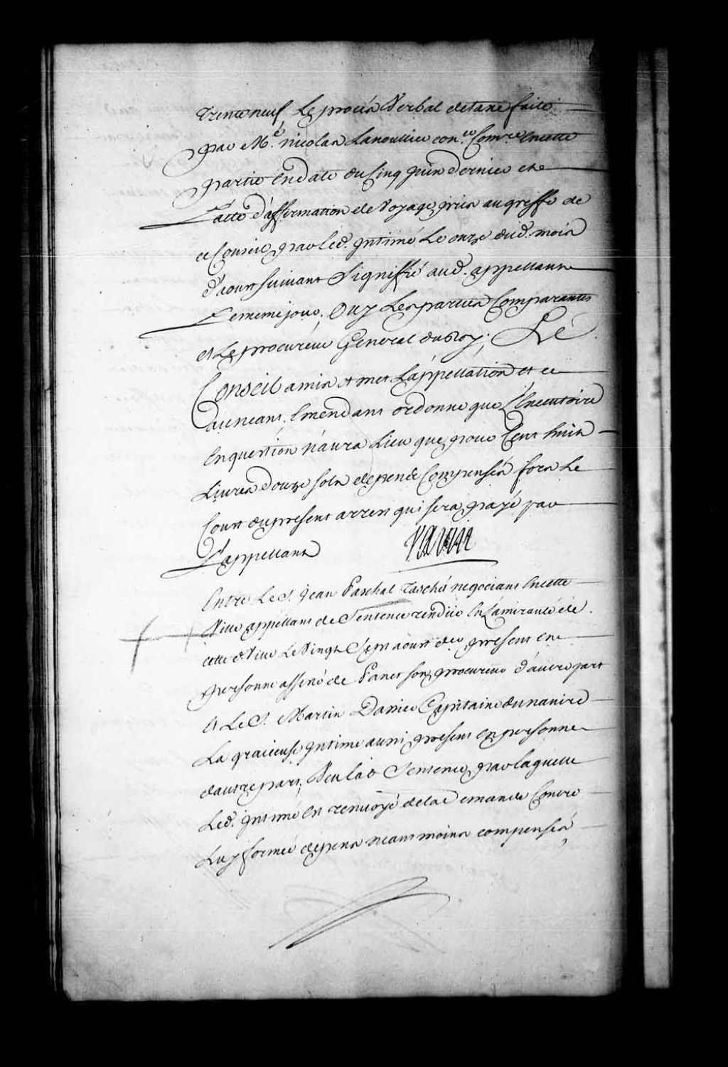 Appel mis à néant de la sentence rendue en l'Amirauté de Québec, le 27 août 1742, dans la cause entre Jean-Pascal Taché, négociant à Québec, et le sieur Martin Dassier, capitaine du navire La Gracieuse, présentement à Québec, 3 septembre 1742, Archives nationales à Québec, Fonds Conseil souverain, (03Q,TP1,S28,P19306).