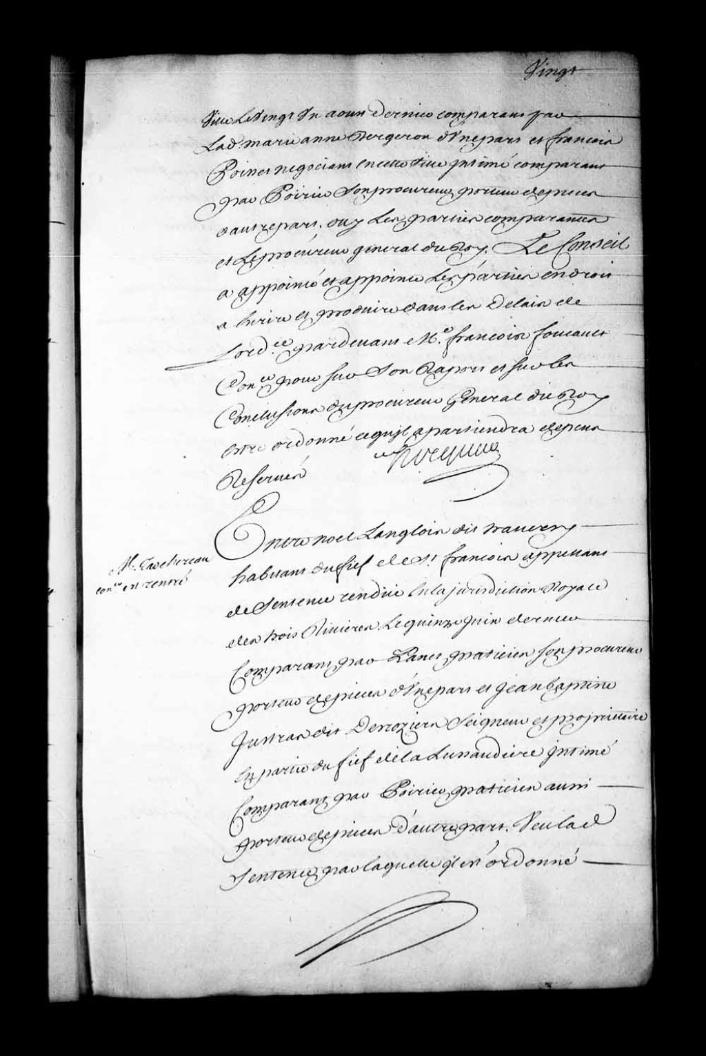 Appel mis à néant de la sentence rendue en la Juridiction des Trois-Rivières, le 15 juin 1742, dans la cause entre Noël Langlois dit Traversy, habitant du fief de Saint-François, contre Jean-Baptiste Jutras dit Desrosiers, seigneur et propriétaire en partie du fief de la Lussaudière. Noël Langlois dit Traversy est condamné à l'amende de 3 livres pour son «fol appel» et aux dépens de la cause d'appel, 1er octobre 1742, Archives nationales à Québec, Fonds Conseil souverain, (03Q,TP1,S28,P19311).