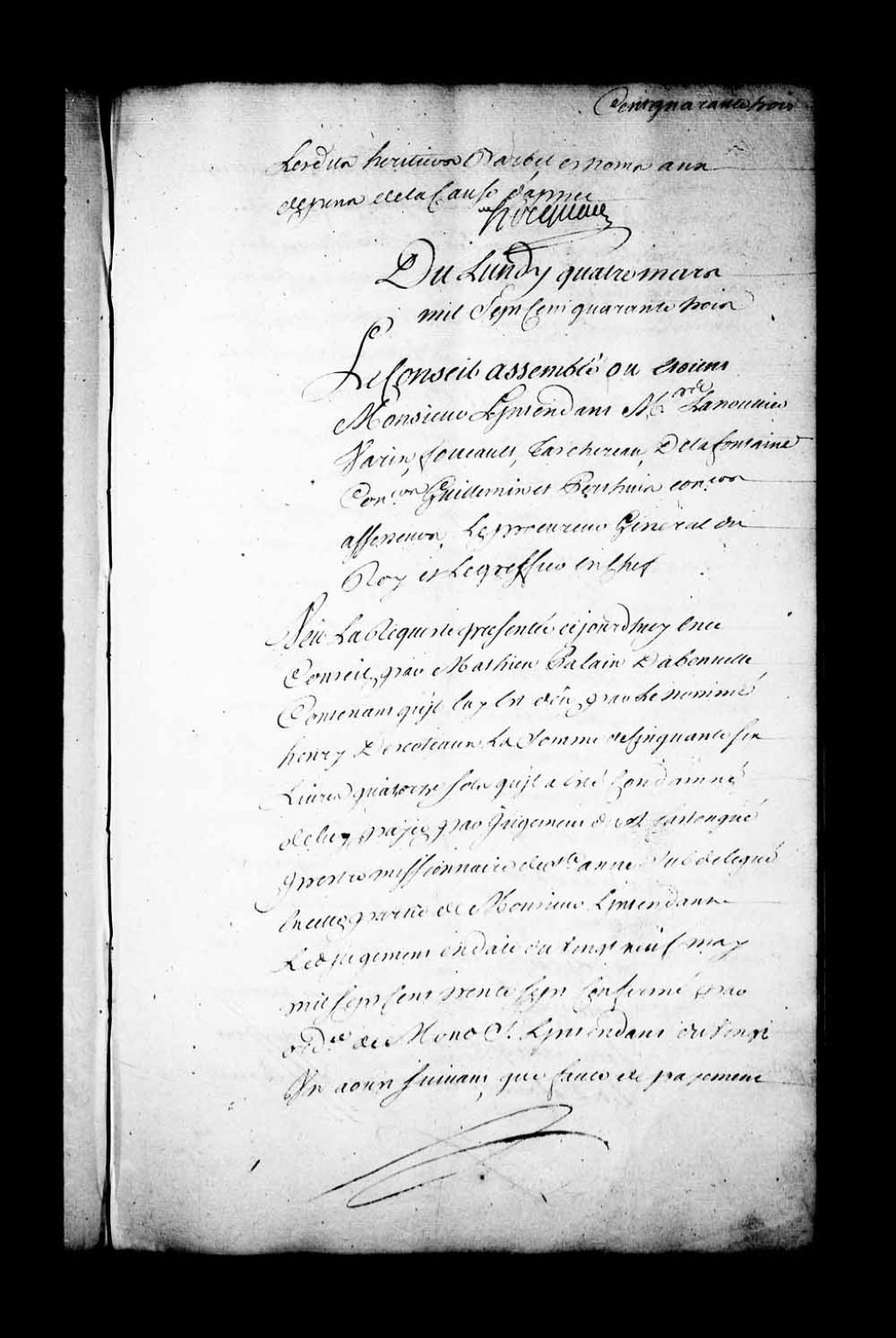 Arrêt qui ordonne, avant de faire droit, que par 2 experts il sera fait estimation de la terre en contestation entre Mathieu Palain Dabonville et Henri Descoteaux, 4 mars 1743, Archives nationales à Québec, Fonds Conseil souverain, (03Q,TP1,S28,P19389).
