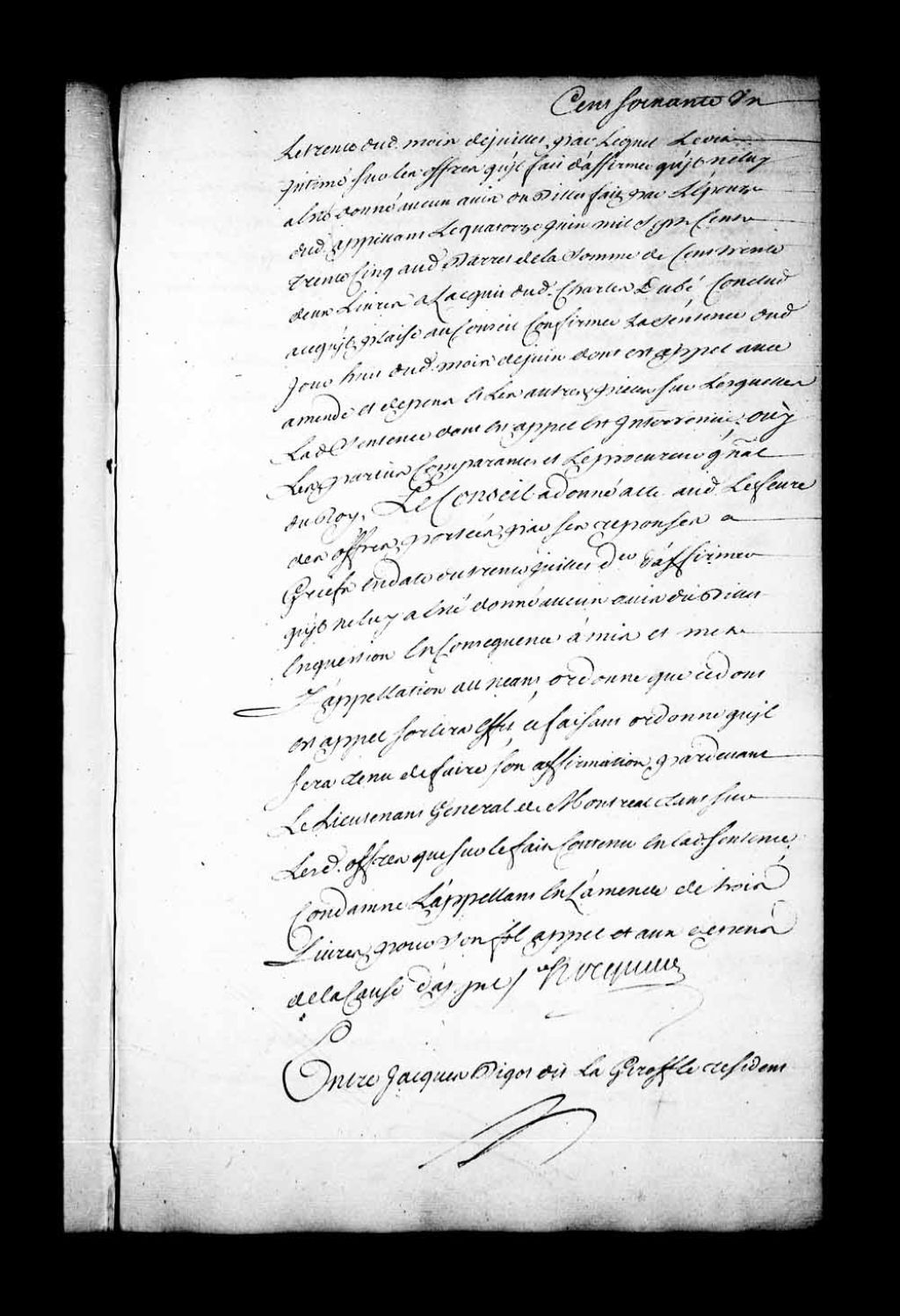 Arrêt qui continue l'audience à lundi prochain, auquel jour sera fait droit aux parties définitivement, dans la cause entre Jacques Bigot dit La Girofflée, résidant à Boucherville et appelant de la sentence rendue en la Juridiction de Montréal, le 8 février 1743, comparant par Geneviève Guillot, femme de Jean-Baptiste Amiot, juge du dit Boucherville, contre Jean-Baptiste Hervieux père, négociant à Montréal, 22 avril 1743, Archives nationales à Québec, Fonds Conseil souverain, (03Q,TP1,S28,P19405).