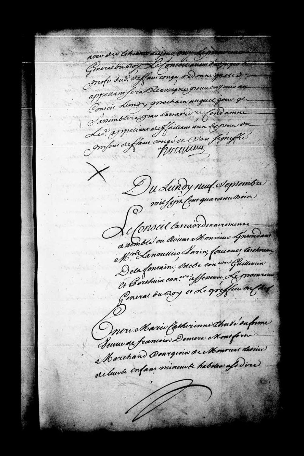 Arrêt dans la cause entre Marie-Catherine Thuné Dufresne, veuve de François Demers Montfort, marchand bourgeois à Montréal, tutrice de ses enfants mineurs, habiles à se porter héritiers de leur défunt père à la communauté de biens duquel elle a renoncé, appelante de la sentence rendue en la Juridiction de Montréal, le 5 février 1743, contre Etienne Rocbert, ancien garde des magasins du Roi à Montréal. Le Conseil accorde à la dite appelante des lettres de rescision contre l'obligation personnellement consentie par elle, le 24 janvier 1738, dans un écrit sous seing-privé entre le sieur Robert (Rocbert) et le défunt François Demers dit Montfort entérinant les dites lettres. La dite appelante remise au même état qu'elle était avant le dit écrit signé par elle, 9 septembre 1743, Archives nationales à Québec, Fonds Conseil souverain, (03Q,TP1,S28,P19489).