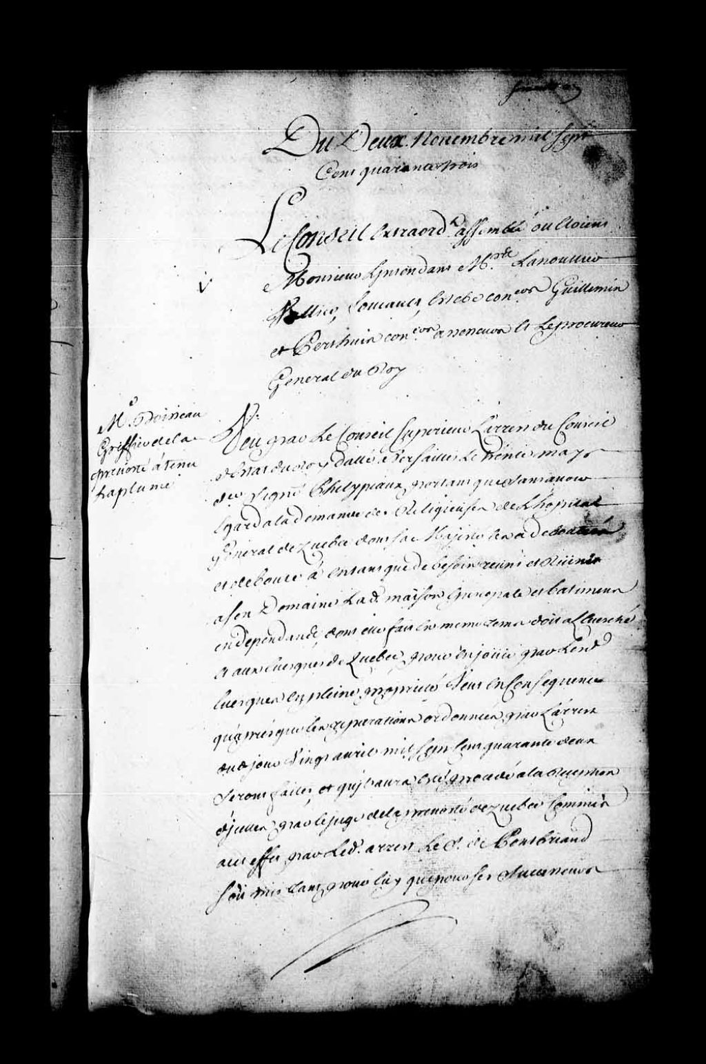 Arrêt qui ordonne que l'arrêt du Conseil du Roi et lettres patentes sur le dit arrêt, datées à Versailles, le 30 mai 1743, seront enregistrées dans les registres du Conseil Supérieur. Le dit arrêt déboute la demande des religieuses de l'Hôpital général de Québec et décide que les bâtiments du dit évêché seront remis à l'évêque de Québec pour en jouir en pleine propriété, 2 novembre 1743, Archives nationales à Québec, Fonds Conseil souverain, (03Q,TP1,S28,P19504).
