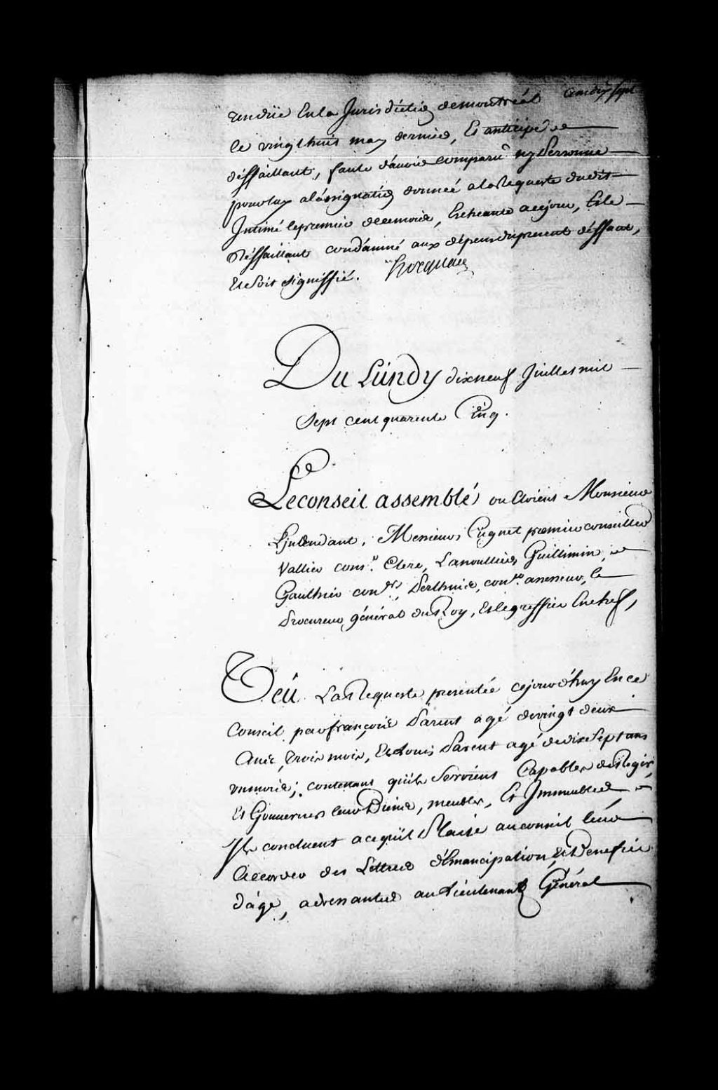 Arrêt qui ordonne, que par le greffier en chef du Conseil, qu'il sera expédié des lettres d'émancipation et bénéfice d'âge à François Parent, âgé de 22 ans et 3 mois, et Louis Parent, âgé de 17 ans et 1 mois, nés à Beauport