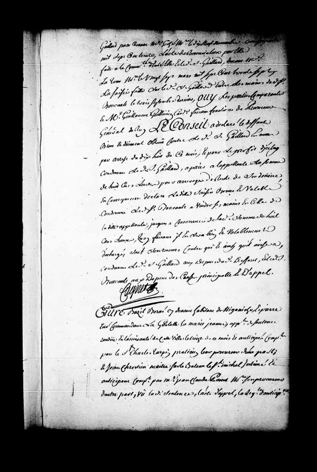 Arrêt qui ordonne, avant de faire droit, que le nommé Levasseur, habitant de la Pointe-Lévis, sera assigné pour être entendu au Conseil dans la cause entre Bazile Borne, habitant de Nigamiche, et Pierre Evé, commandant la goélette la Marie-Jeanne, appelants de la sentence rendue en l'Amirauté de Québec, le 13 octobre 1745, contre Jean Chrétien, maître sur le bateau le Saint-Michel, 25 octobre 1745, Archives nationales à Québec, Fonds Conseil souverain, (03Q,TP1,S28,P19829).