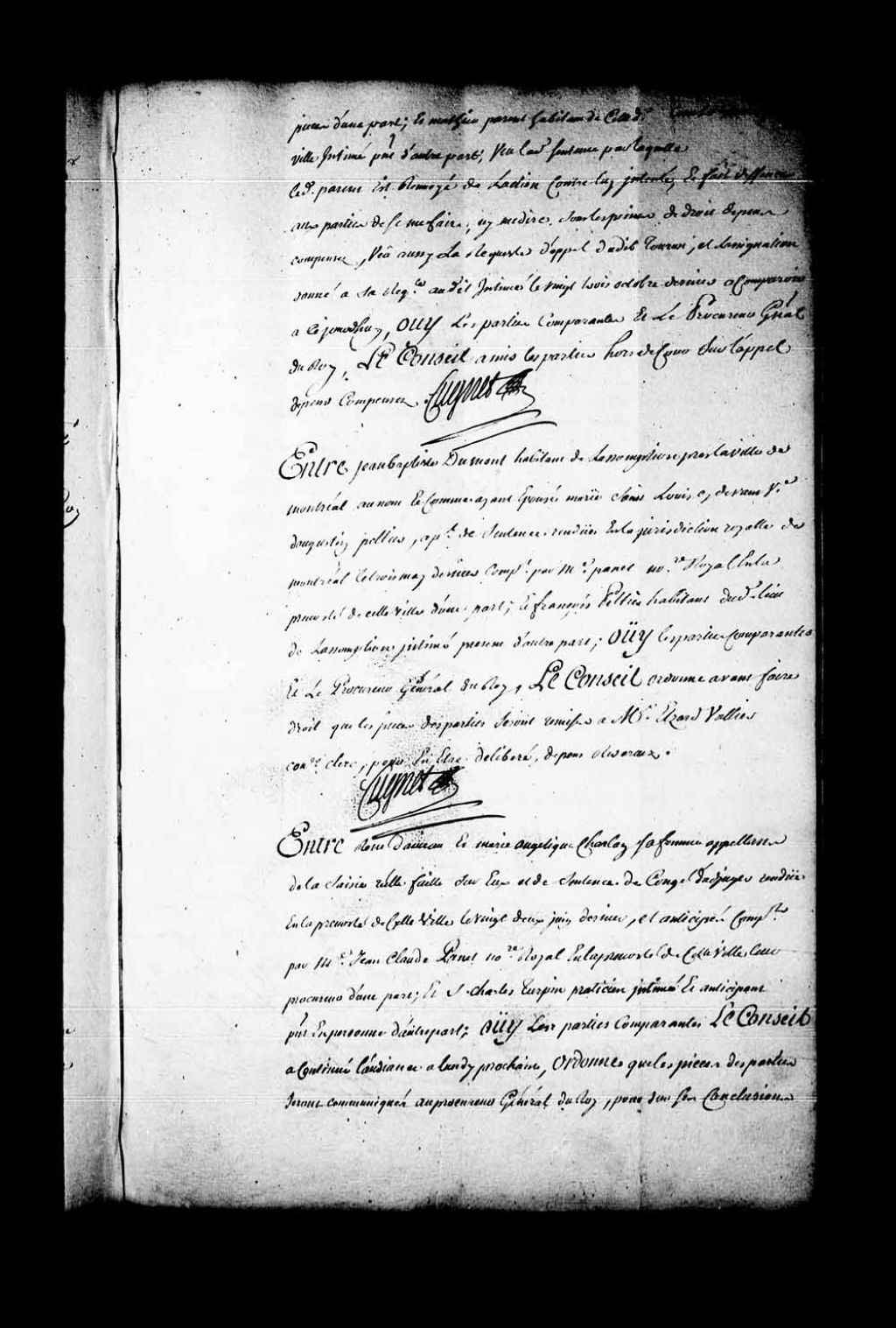 Arrêt qui ordonne, avant de faire droit, que les pièces des parties seront remises au sieur Elzéar Vallier, conseiller clerc, pour en être délibéré dans la cause entre Jean-Baptiste Dumont, habitant de l'Assomption, au nom et comme époux de Marie Saint-Louis, veuve de feu Augustin Pelletier, appelant. de la sentence rendue en la Juridiction de Montréal, le 3 mai 1745, contre François Pelletier, habitant de l'Assomption, 15 novembre 1745, Archives nationales à Québec, Fonds Conseil souverain, (03Q,TP1,S28,P19834).