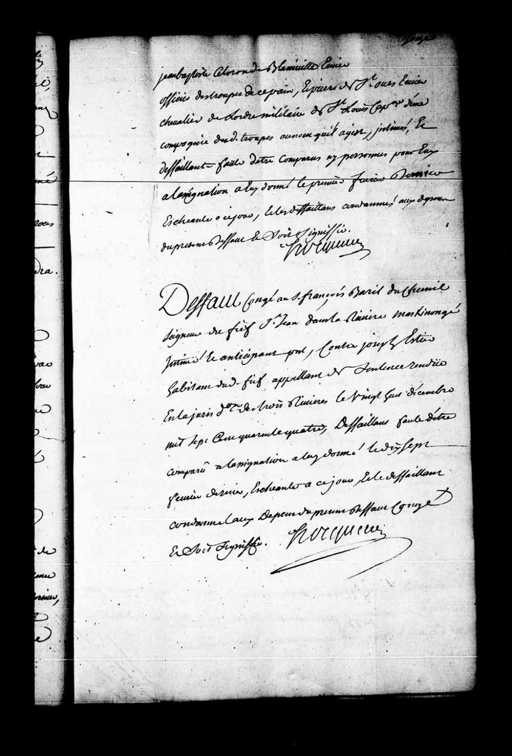 Arrêt qui accorde défaut à François Baril Dumesnil, seigneur du fief Saint-Jean dans la rivière Maskinongé, contre Joseph Natier, habitant du fief Saint-Jean et appelant de la sentence rendue en la Juridiction des Trois-Rivières, le 28 décembre 1744