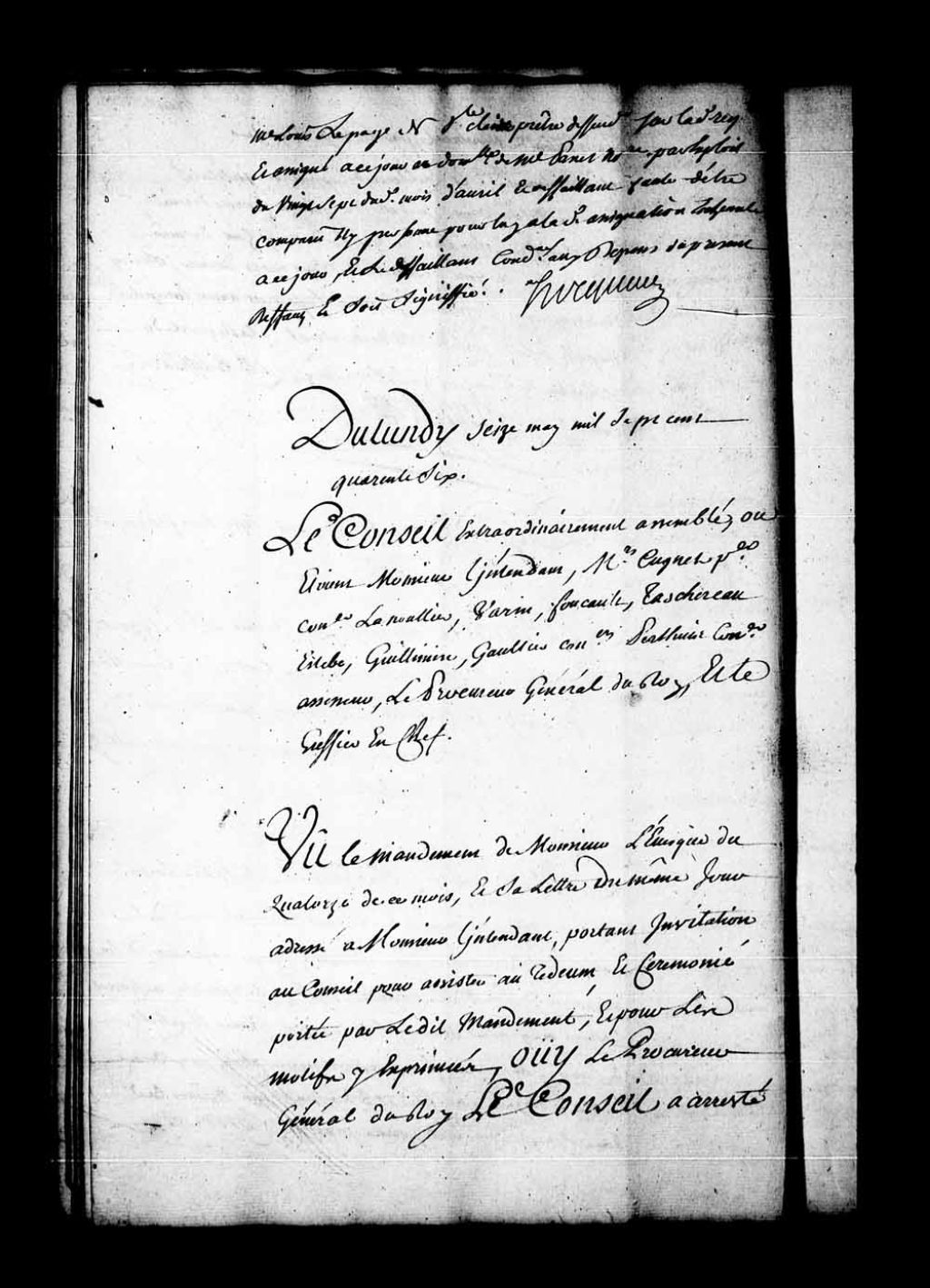 «Vu le mandement de monsieur l'Évêque de Québec, du 14 mai 1746, et la lettre du même jour adressée à monsieur l'Intendant, portant invitation au Conseil pour assister au Te Deum, le dit mandement et la dite lettre seront enregistrés au greffe de ce Conseil. Le Conseil ordonne qu'il s'assemblera jeudi prochain, deux heures de relevée, suivant l'usage, au Palais, pour de là aller en corps à l'église paroissiale assister au dit Te Deum. Les officiers de la Prévôté et l'Amirauté de Québec seront avertis de se trouver à la dite cérémonie»