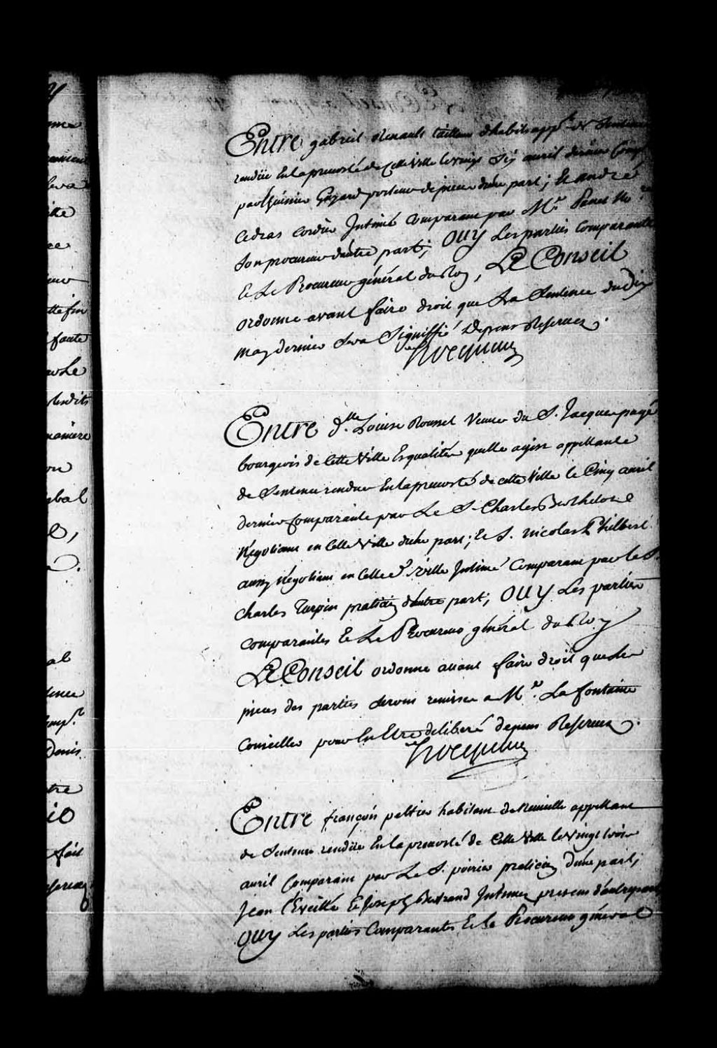 Arrêt qui appointe les parties en droit à écrire et produire dans les délais de l'ordonnance, devant M. Gaultier, conseiller, pour, sur son rapport, être fait droit à qui il appartiendra dans la cause entre François Peltier, habitant de Neuville, appelant de la sentence rendue en la Prévôté de Québec le 23 avril 1746, contre les intimés Jean Léveillé et Joseph Bertrand, 27 juin 1746, Archives nationales à Québec, Fonds Conseil souverain, (03Q,TP1,S28,P19935).