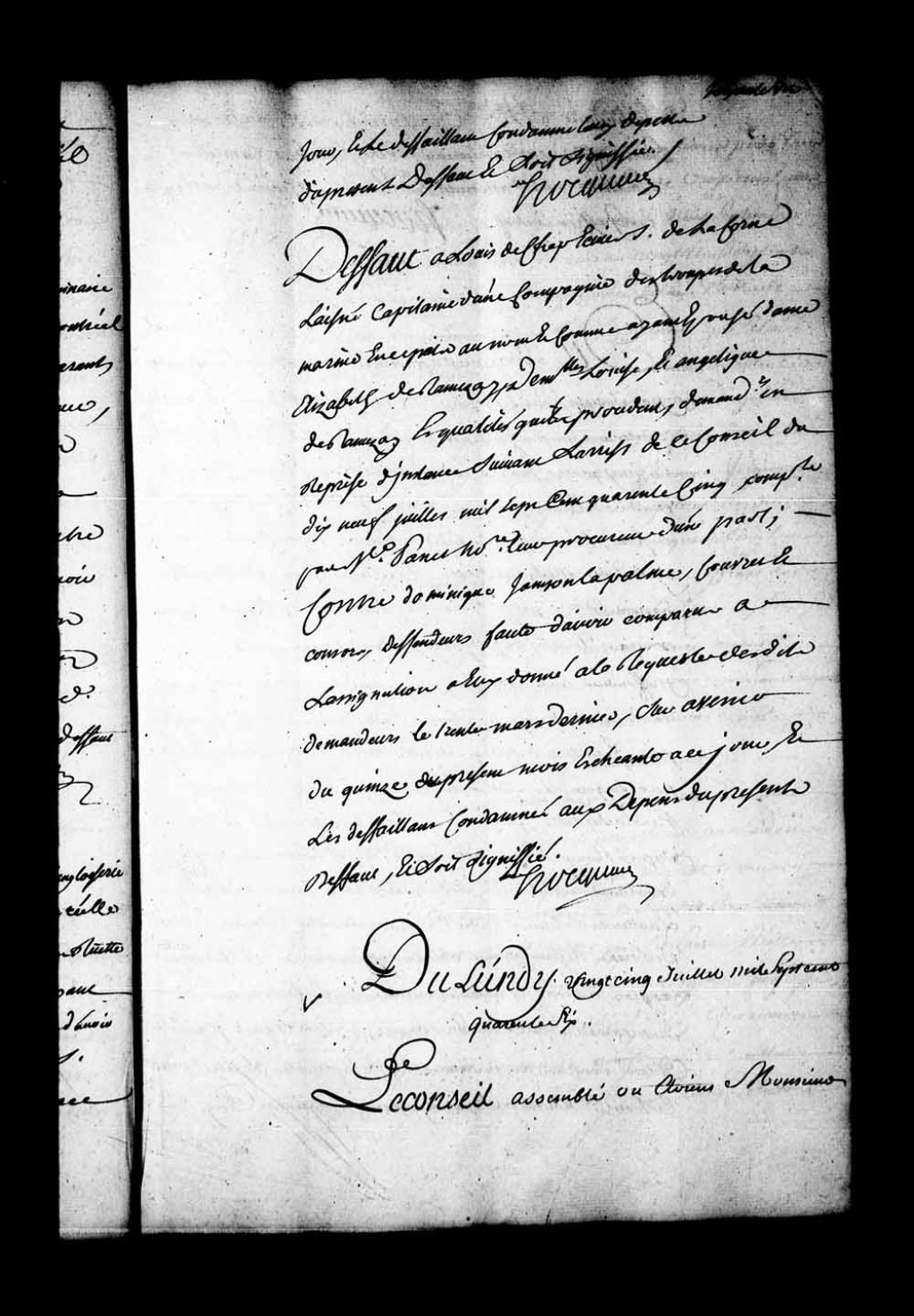 Arrêt qui ordonne, avant de faire droit, que par experts il sera procédé à la visite et estimation du terrain et maison construite dessus et saisis, sur Etienne Camanne, maçon, par Joseph-Simon Delorme, charpentier de maison à Québec, pour une dette de 1 100 livres, 25 juillet 1746, Archives nationales à Québec, Fonds Conseil souverain, (03Q,TP1,S28,P19959).