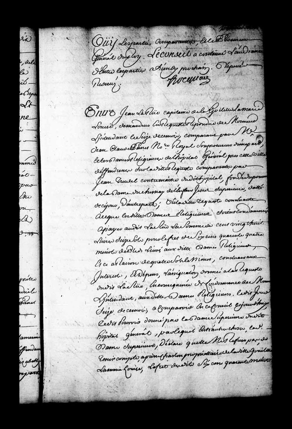 Arrêt qui ordonne que Pierre Chalou, propriétaire de la goélette la Marie-Louise, sera mis en cause dans l'affaire entre Jean Larue, capitaine de la dite goélette, contre les Dames religieuses de l'Hôpital général de Québec. Procès pour le fret de 644 minots de blé transportés par la Marie-Louise, 25 juillet 1746, Archives nationales à Québec, Fonds Conseil souverain, (03Q,TP1,S28,P19961).