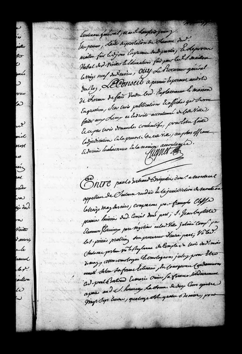 Appel mis à néant de la sentence rendue en la Juridiction de Montréal, le 13 mai 1746, dans la cause entre Paul Bertrand, briquetier demeurant à Montréal, contre Jean-Baptiste Eléonore l'Ervieux père, négociant à Montréal. Paul Bertrand est condamné à l'amende de 3 livres pour son «fol appel» et aux dépens de la cause d'appel, 1er août 1746, Archives nationales à Québec, Fonds Conseil souverain, (03Q,TP1,S28,P19966).