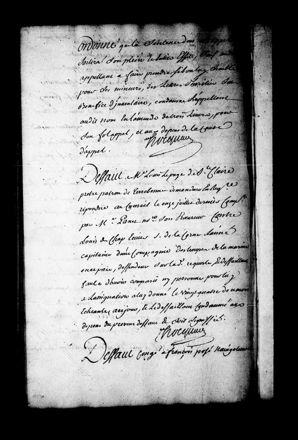 Arrêt qui accorde défaut à Louis Lepage de Sainte-Claire, prêtre et patron de Terrebonne, demandeur en requête répondue au Conseil le 11 juillet 1746, contre Louis de Chapt de Lacorne l'aîné, capitaine dans les troupes, 27 février 1747, Archives nationales à Québec, Fonds Conseil souverain, (03Q,TP1,S28,P20037).