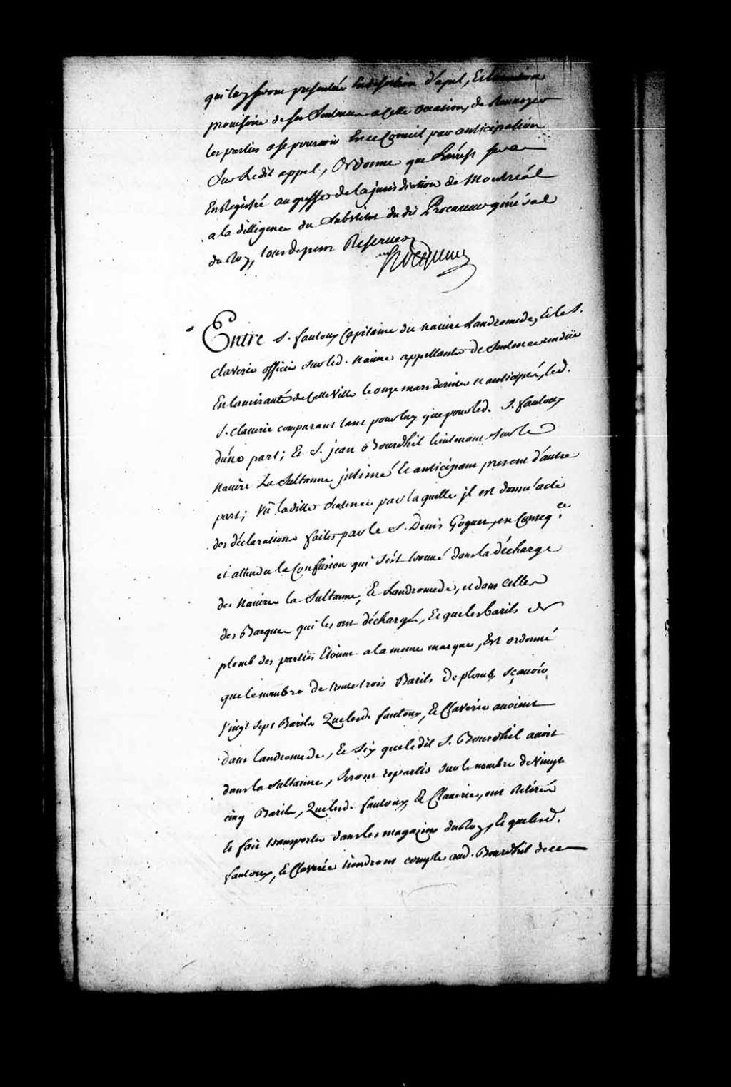 Appel mis à néant de la sentence rendue en l'Amirauté de Québec, le 11 mars 1747, dans la cause entre le sieur Fautoux, capitaine du navire l'Andromède, et le sieur Claverie, officier sur le dit navire, contre le sieur Jean Bourdhil, lieutenant sur le navire La Sultane. Procès à propos de la décharge des navires La Sultane et l'Andromède, les cargaisons s'étant trouvées mêlées dans les barques qui les transportaient sur les quais, 15 mai 1747, Archives nationales à Québec, Fonds Conseil souverain, (03Q,TP1,S28,P20068).