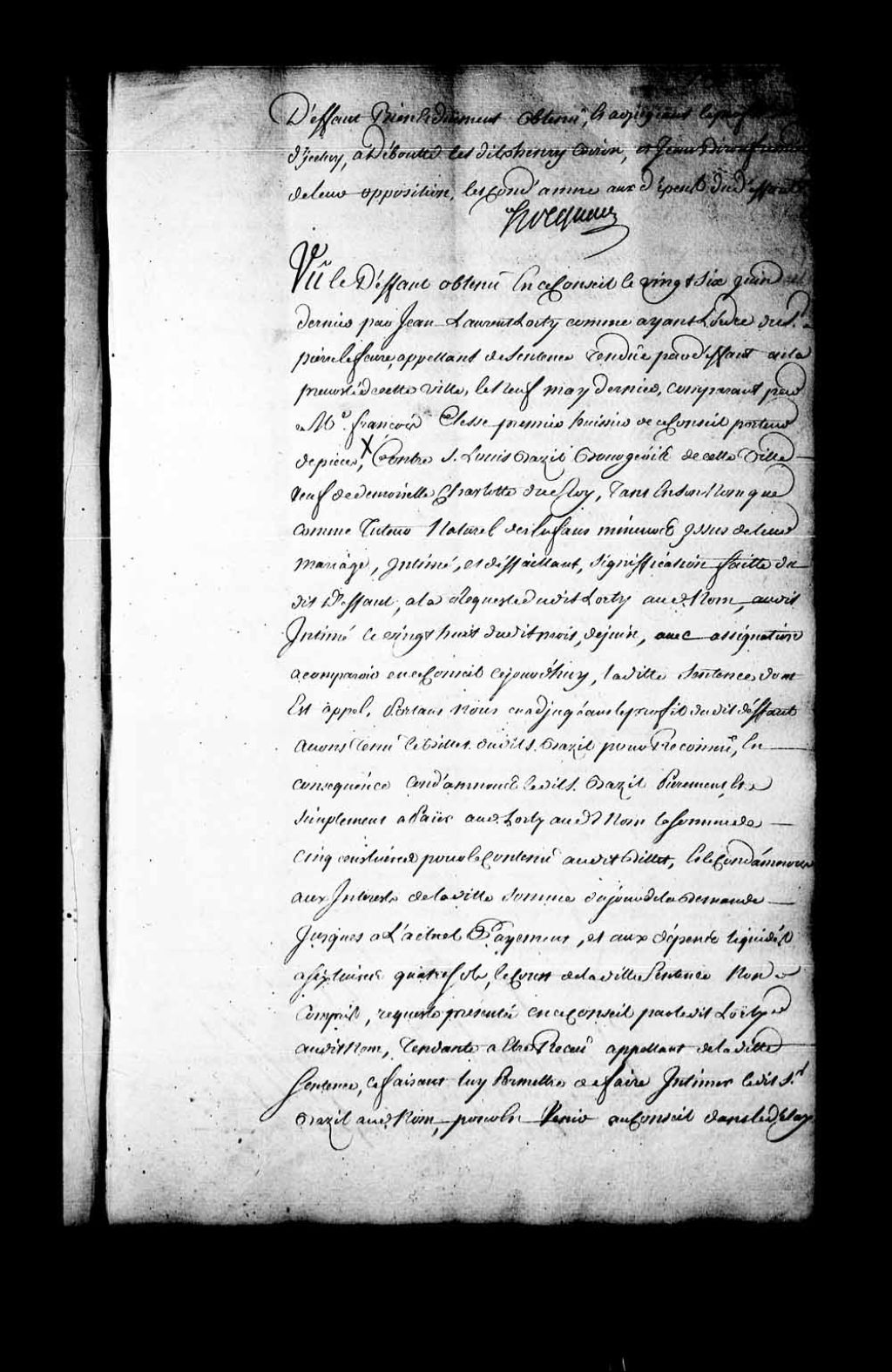 Arrêt qui déclare bien et dûment obtenu le défaut accordé en ce Conseil, le 26 juin 1747, à Jean Laurent Lortie, comme ayant l'ordre de Pierre Lefebvre, appelant de la sentence rendue par défaut en la Prévôté de Québec, le 9 mai 1747, contre Louis Bazil, bourgeois de Québec, veuf de Charlotte DuRoy, tant en son nom que comme tuteur naturel des enfants mineurs issus de leur mariage; le Conseil, adjugeant le profit du dit défaut, met l'appel à néant en ce que Bazil est condamné purement et simplement, émendant quant à ce, condamne le dit Bazil en son propre et privé nom à payer au dit Lortie la somme de 500 livres