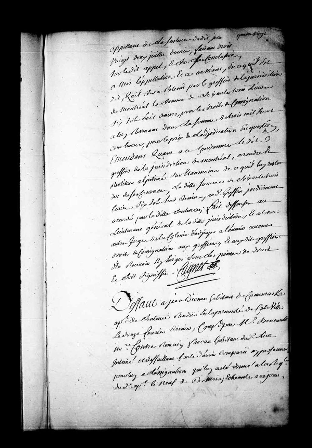 Arrêt qui accorde défaut-congé à Jean Dionne, habitant de Kamouraska et appelant de la sentence rendue en la Prévôté de Québec, le 12 février 1748, contre Romain Faucas, habitant de Kamouraska, 18 mars 1748, Archives nationales à Québec, Fonds Conseil souverain, (03Q,TP1,S28,P20165).