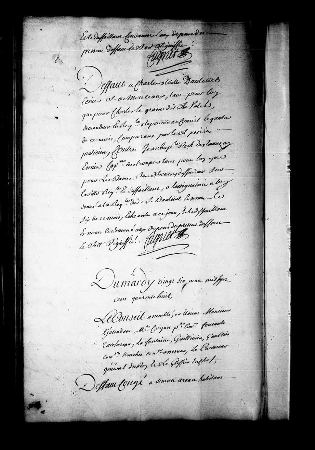 Arrêt qui accorde défaut-congé à Simon Arcand, habitant de la Chevrotière, comparant par le sieur Charles Turpin, praticien, contre François et Pierre Montambault, frères, et Pierre-Joseph Grosleau, habitants du dit lieu de la Chevrotière et appelants de la sentence rendue en la Prévôté de Québec, le 8 mars 1748