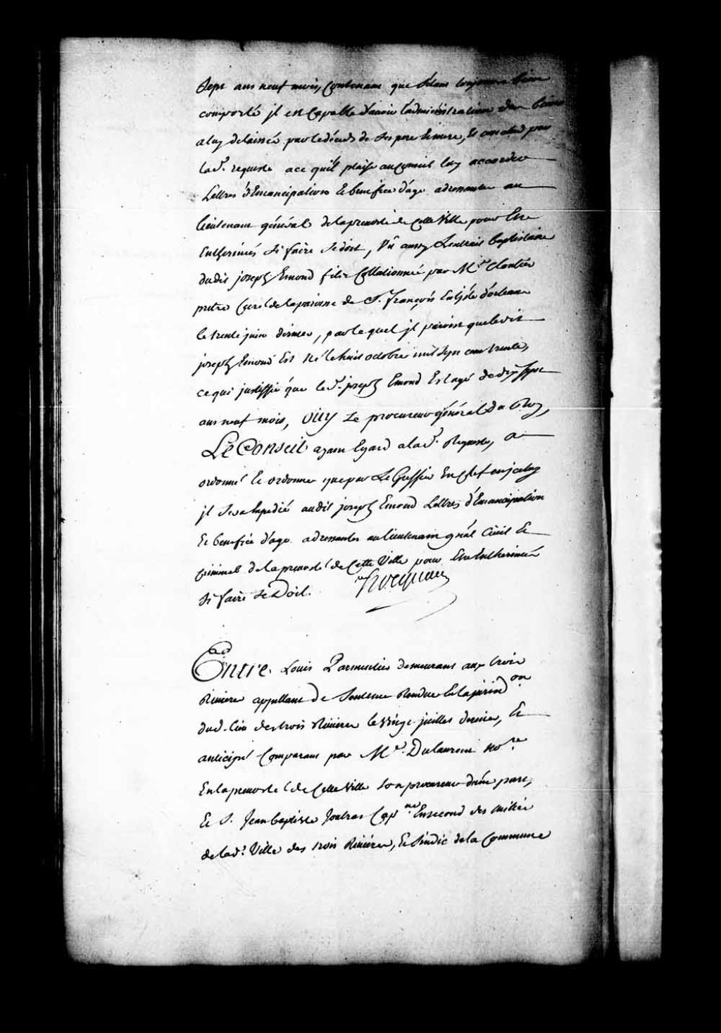 Appel mis à néant de la sentence rendue en la Juridiction des Trois-Rivières, le 20 juillet 1747, dans la cause entre Louis Parmentier, demeurant aux Trois-Rivières, contre Jean-Baptiste Jutras, capitaine en second des milices de la dite ville des Trois-Rivières et syndic de la commune du dit lieu. Le Conseil déclare toute la procédure et la dite sentence nulle et évoquant le principal et y faisant droit, a mis hors de cour sur la demande de Jutras, du 12 juillet 1747, fait défenses respectives aux parties de se méfaire ni médire, dépens compensés. Faisant droit sur le réquisitoire du procureur général du Roi, ordonne que le sieur Pillard qui a rendu la sentence en appel restituera à Jutras la somme de 24 livres indûment exigée par lui au-delà de ce qui lui était légitimement dû, 8 juillet 1748, Archives nationales à Québec, Fonds Conseil souverain, (03Q,TP1,S28,P20213).