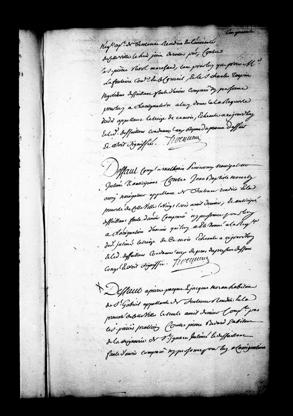 Défaut-congé à Pierre Paquet et Jacques Moran, habitants de Saint-Gabriel et appelants de la sentence rendue en la Prévôté de Québec, le 30 avril 1748, contre Pierre Bédard, habitant de la seigneurie de Saint-Ignace, 15 juillet 1748, Archives nationales à Québec, Fonds Conseil souverain, (03Q,TP1,S28,P20224).