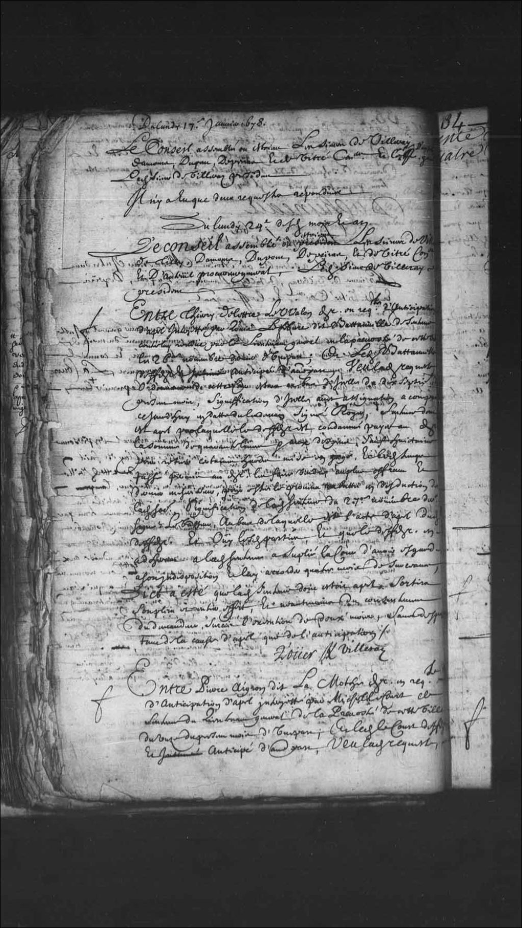 - Transcription du texte avec orthographe modernisée : «Entre Pierre AIGRON dit LAMOTHE demandeur en requête d'anticipation d'appel interjeté par Michel LeCourt de sentence du lieutenant général de la prévôté de cette ville du onze du présent mois d'une part, et ledit LECOURT défendeur et anticipé d'autre part, vu ladite requête, la sentence sus-datée, signification d'icelle signée Hubert du quatorze du présent mois, au bas de laquelle est l'acte de l'appel dudit LeCourt, requête dudit LeCourt tendante à être reçu à son appel, et ouï lesdites parties, la Cour ordonne que la requête dudit LeCourt sera communiquée audit Aigron pour en venir à huitaine auquel jour les parties feront respectivement comparaître leurs témoins, et que ledit LeCourt représentera le marché par écrit qu'il prétend avoir été fait. ROUER DE VILLERAY.»
