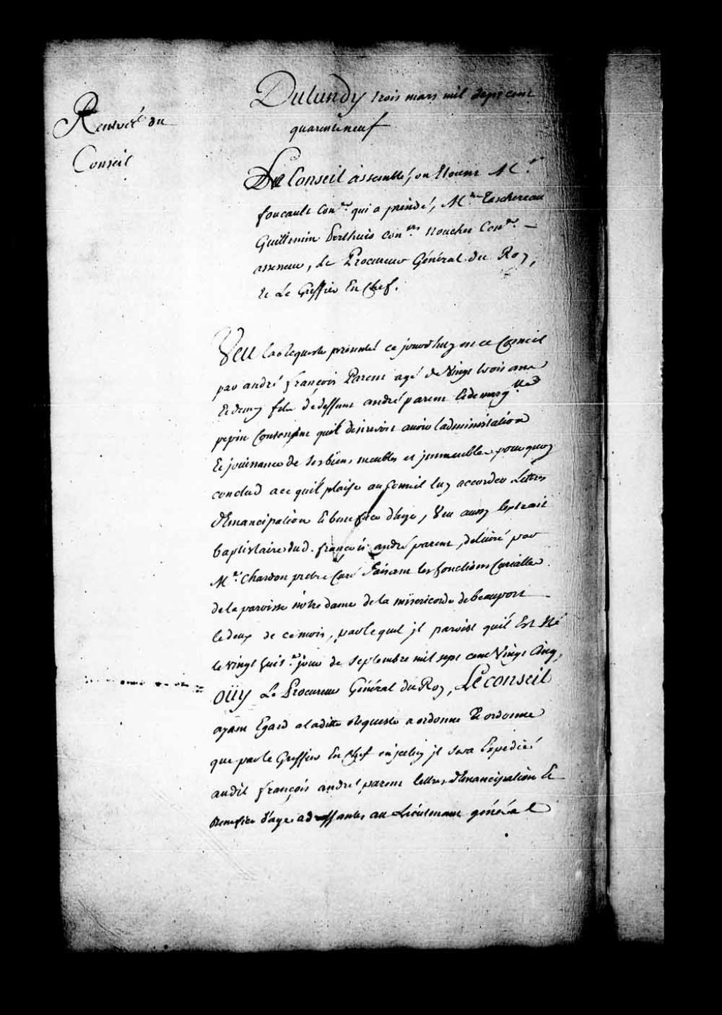 Arrêt qui ordonne, que par le greffier en chef du Conseil, qu'il sera expédié des lettres d'émancipation et bénéfice d'âge à François Parent, âgé de 23 ans et demi, né à Beauport le 28 septembre 1725, fils de feu André Parent et de Marguerite Pépin