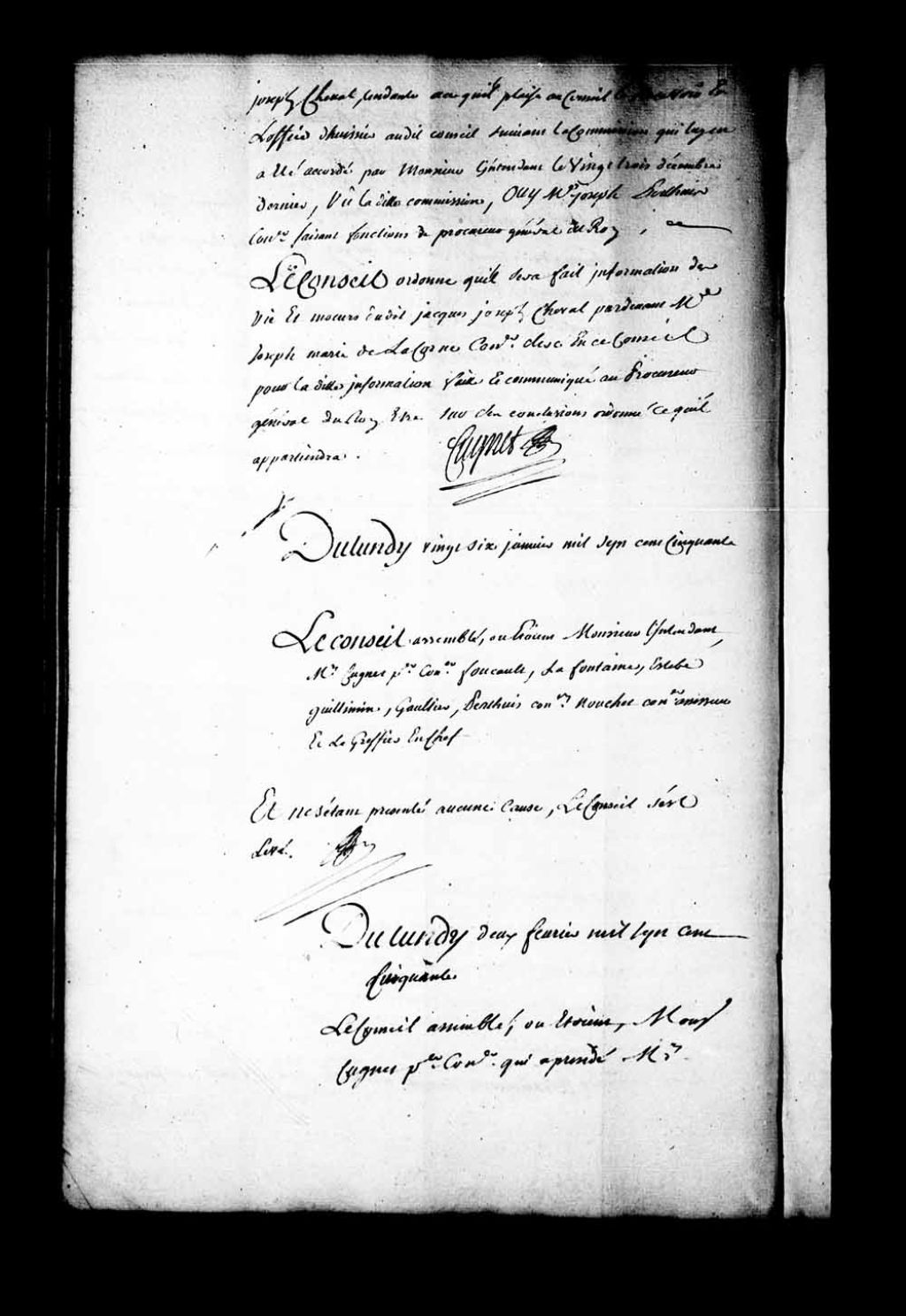 Arrêt qui, dans la cause entre Louis Damours de Courberon et Clément Langlois, habitant du Bras Saint-Nicolas, paroisse de Saint-Thomas, ordonne, avant de faire droit, que visite et estimation de la terre et bâtiments dont il est question sera faite par experts s'y connaissants pour qu'une fois le rapport des dits experts soumis au Conseil puisse être ordonné ce qu'il appartiendra, 2 février 1750, Archives nationales à Québec, Fonds Conseil souverain, (03Q,TP1,S28,P20448).