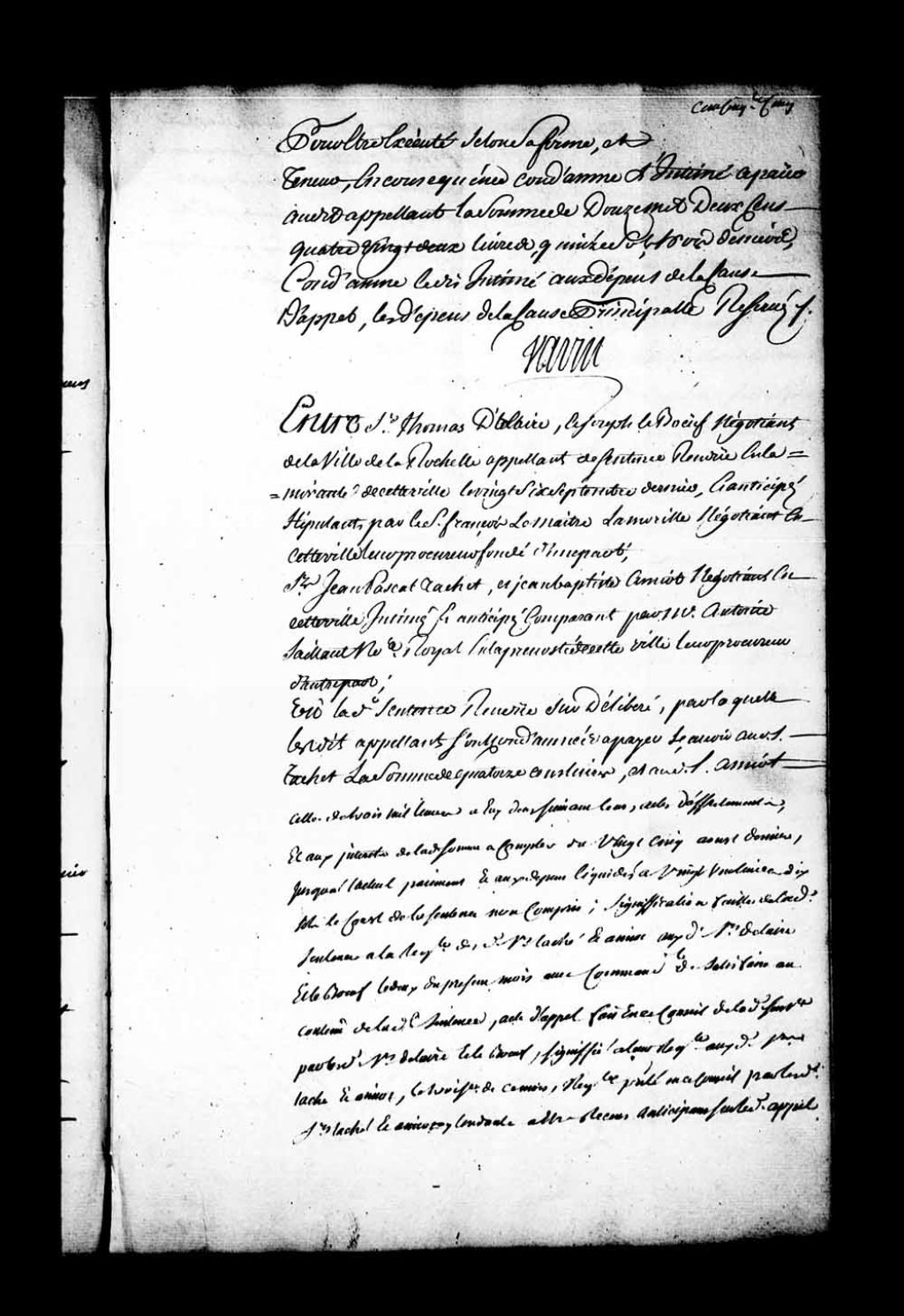 Appel mis à néant de la sentence rendue en l'Amiraut de Québec, le 26 septembre 1750, dans la cause entre les sieurs Thomas Dallaire et Joseph Lebeuf, négociants en la ville de Larochelle, contre les sieurs Jean-Pascal Taché et Jean-Baptiste Amiot, négociants en la ville de Québec. Thomas Dallaire et Joseph Lebeuf sont condamnés à l'amende de 3 livres pour leur «fol appel» et aux dépens de la cause d'appel, 19 octobre 1750, Archives nationales à Québec, Fonds Conseil souverain, (03Q,TP1,S28,P20529).