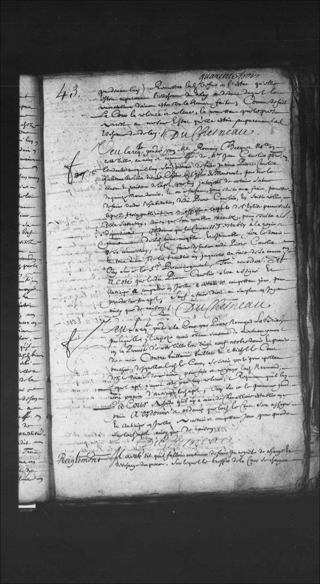 - Transcription du texte avec orthographe modernisée : «Il a été dit qu'il fallait continuer de tenir un registre de charge et décharge des procès, sur lequel le greffier de la Cour se chargera des procès qui lui seront apportés, comme aussi Monsieur le procureur général et Messieurs les conseillers auxquels ils seront distribués, le tout aux termes de la dernière ordonnance. DUCHESNEAU.»