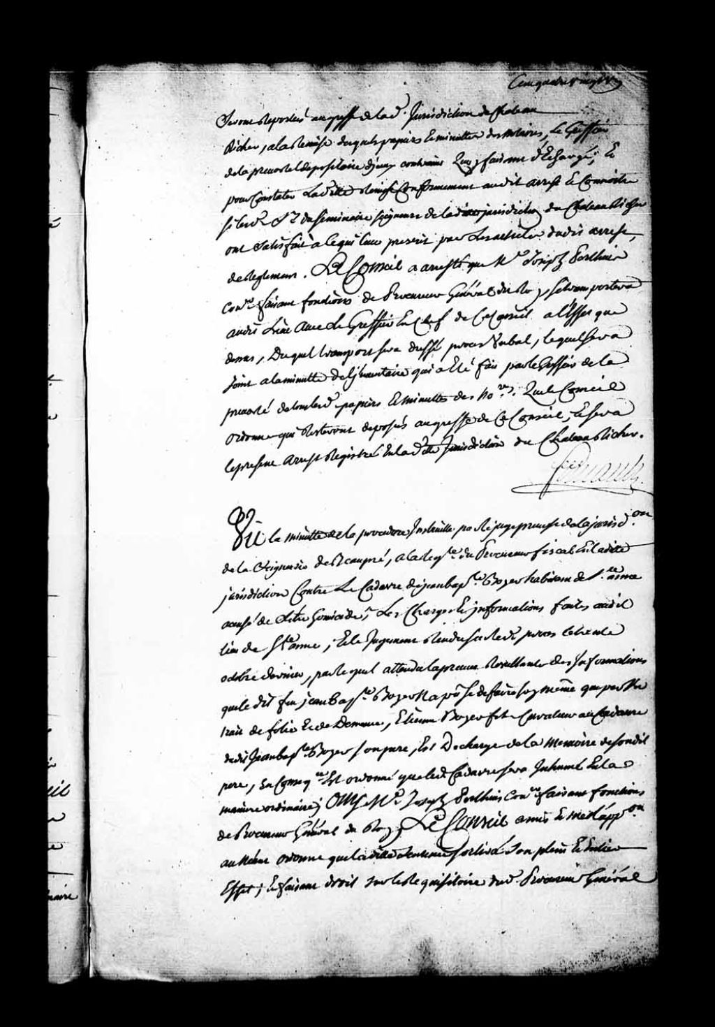 Vu la minute de la procédure instruite par le juge de la Juridiction de Beaupré contre le cadavre de Jean-Baptiste Boyer, habitant de Sainte-Anne, accusé de s'être homicidé, et le jugement rendu le 30 octobre 1750, par lequel, attendu la preuve résultant des informations que le dit feu Jean-Baptiste Boyer n'a pu se défaire soi-même que par un trait de folie et de démence, Etienne Boyer fils, curateur au cadavre de son père, est déchargé de la mémoire de son dit père. En conséquence, il est ordonné que le cadavre sera inhumé en la manière ordinaire. Joseph Perthuis, faisant fonctions de procureur général, le Conseil a mis l'appel à néant et a ordonné que la dite sentence sortira son plein effet. Faisant droit sur le réquisitoire du procureur général, le Conseil a enjoint au juge prévôt de la Juridiction de Beaupré que lorsque le cas arrivera de procéder à l'instruction des procès criminels, de se conformer à l'article 6 du titre 26 de l'Ordonnance criminelle et de faire rapporter en ce Conseil les procès qu'il aurait instruits. Fait également défense à l'avenir d'exécuter ses jugements en pareil cas sous les peines de droit