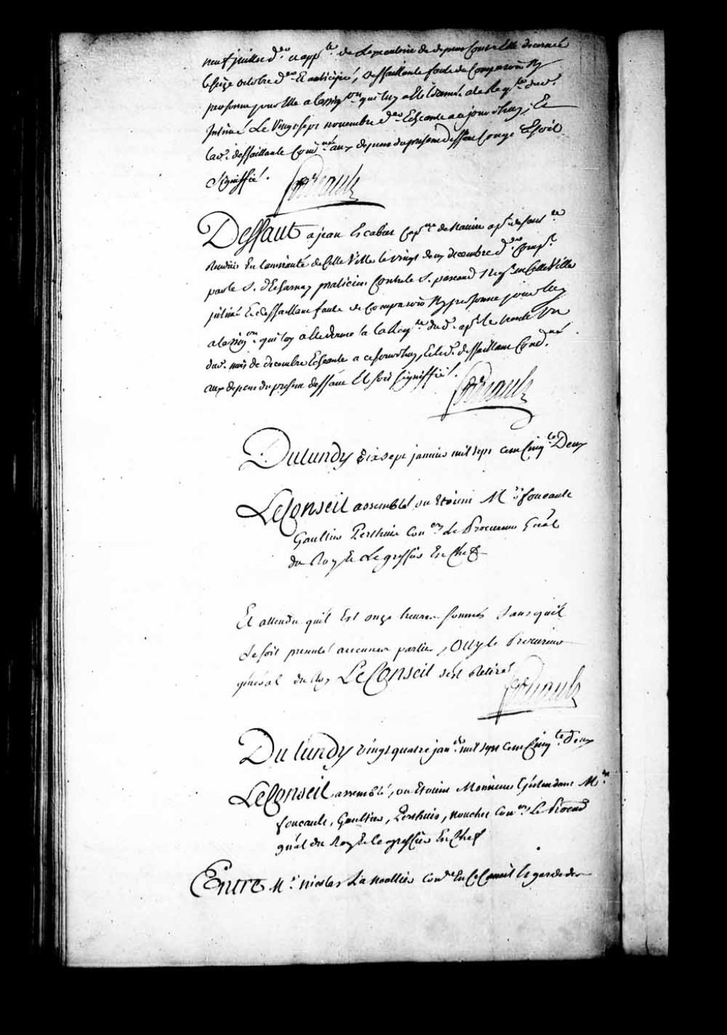Appel mis à néant de la sentence rendue en la Prévôté de Québec, le 15 juin 1751, dans la cause entre Nicolas Lanoullier, conseiller en ce Conseil et garde des sceaux, contre Guillaume Stroud, intimé. Le Conseil, du consentement des parties, a résilié l'acte de société et marché en contestation. Les parties demeureront respectivement quittes pour raison des exploitations qui ont été faites concernant la dite société. Le sieur Stroud sera tenu de faire enlever dans le mois de mars prochain la maison de bois qu'il a fait construire sur la terre du sieur Lanoullier pour retirer les travaillants, 24 janvier 1752, Archives nationales à Québec, Fonds Conseil souverain, (03Q,TP1,S28,P20707).