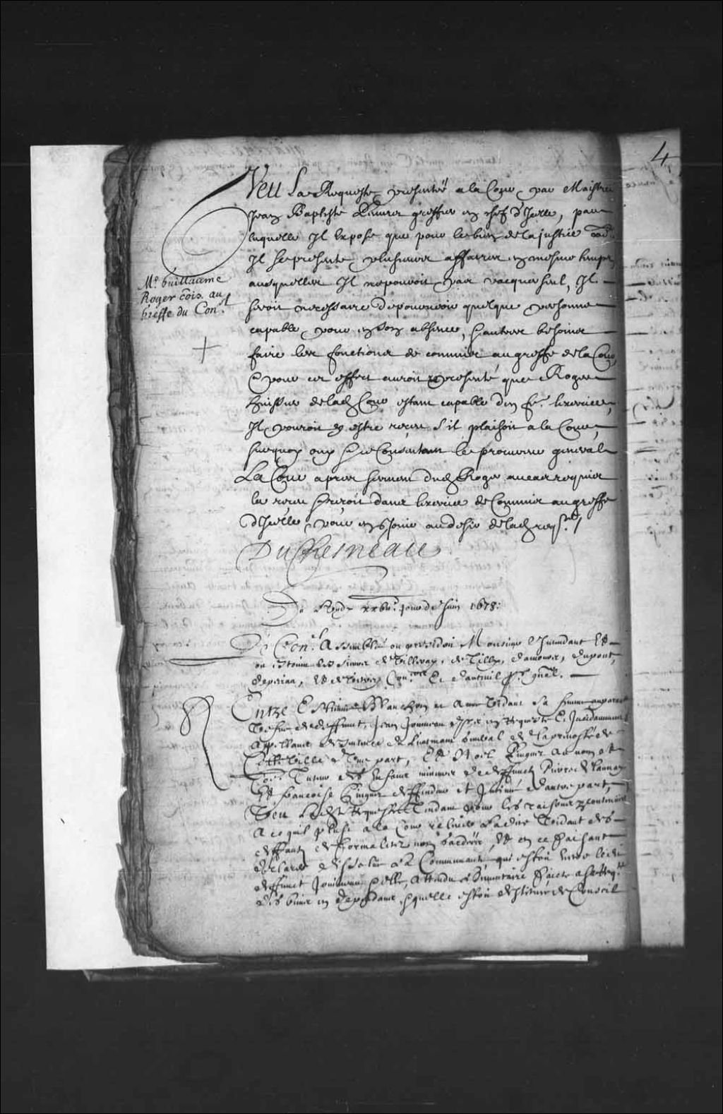 Nomination de Guillaume Roger, huissier, comme commis au greffe du Conseil, 20 juin 1678, Archives nationales à Québec, Fonds Conseil souverain, (03Q,TP1,S28,P2073).