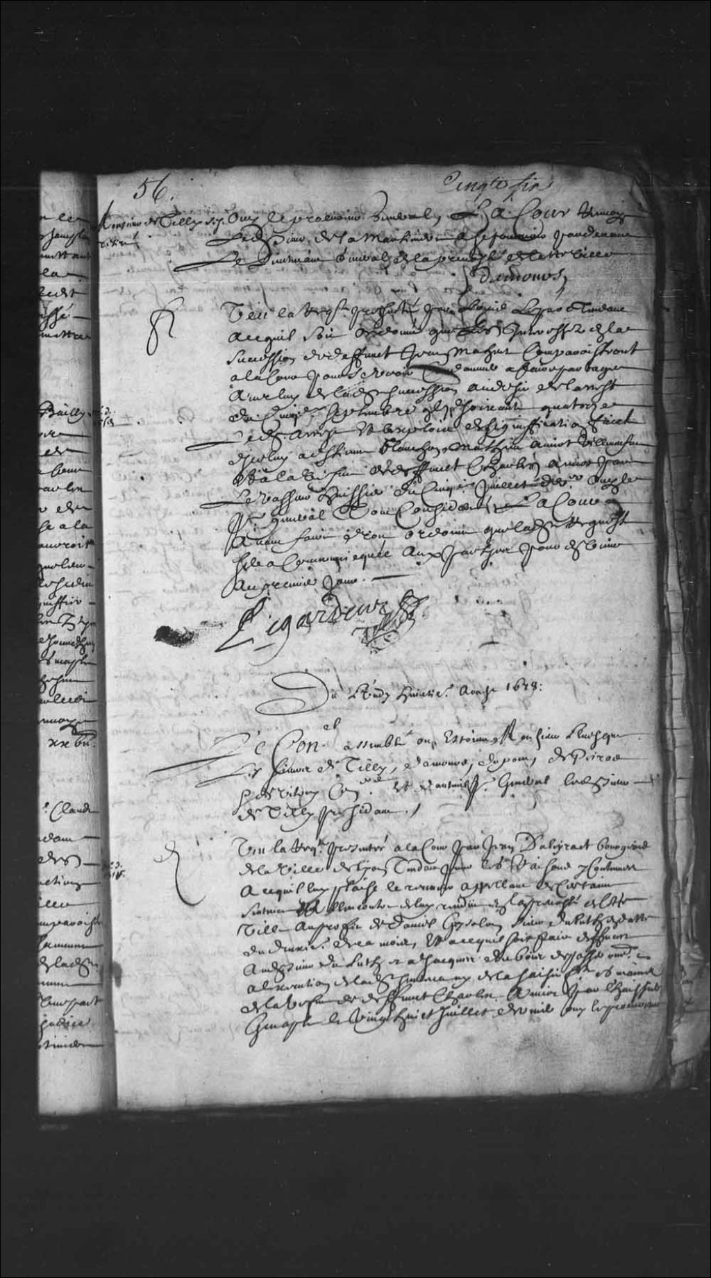 - Transcription du texte avec orthographe modernisée : «Du lundi huitième août 1678. Le Conseil assemblé où étaient Monsieur l'évêque, les sieurs de Tilly, Damours, Dupont, Depeiras et de Vitray conseillers et d'Auteuil procureur général, ledit sieur de Tilly président. Vu la requête présentée à la Cour par Jean Daleyract bourgeois de la ville de Lyon tendant pour les raisons y contenues à ce qu'il lui plaise le recevoir appelant de certaine sentence à l'encontre de lui rendue en la prévôté de cette ville au profit de Daniel Grysolon sieur Duluth en date du deuxième de ce mois et à ce qu'il soit fait défense audit sieur Duluth et à Jacques Dubois de passer outre à l'exécution de ladite sentence ni de la saisie faite en les mains de la veuve de défunt Charles Amiot par l'huissier Genaple le vingt-huit juillet dernier, ouï le procureur, la Cour a reçu et reçoit ledit sieur Daleyract appelant de ladite sentence, permis à lui de faire intimer [...]