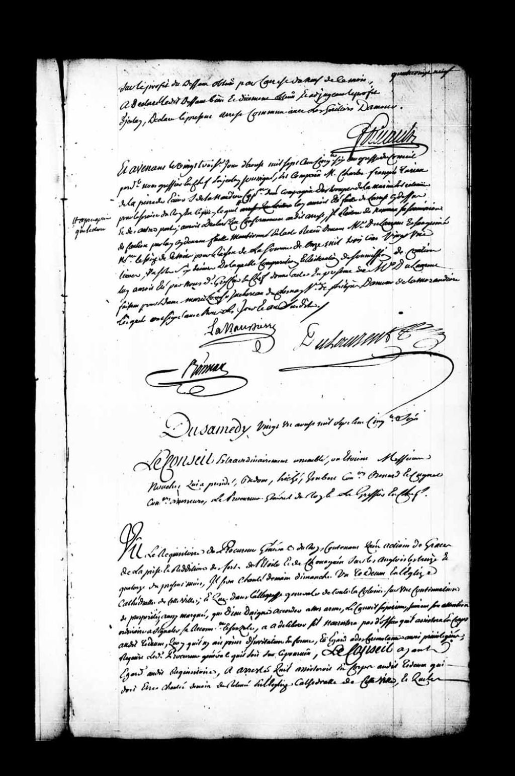 Acte de cautionnement fourni par Charles-François Tarieu de la Pérade, sieur de Lanaudière, capitaine dans les troupes, en faveur de madame de la Morendière, au désir de l'arrêt de ce Conseil, du 16 août 1756