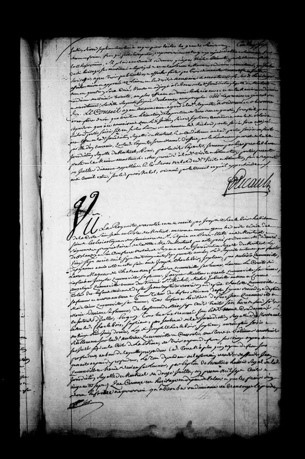 Arrêt dans la cause entre Joseph Charlebois, habitant de la côte Saint-Jean, en l'île de Montréal, au nom et comme ayant les droits cédés des Sieurs Ecclésiastiques du Séminaire de Saint-Sulpice, de Montréal, et Antoine Quenneville, Laurent Magner dit Châteauneuf et Louise Quenneville, sa femme, Laurent Lecomte dit Lafleur et Josephte Quenneville, sa femme, Jacques Meilleur et Ursule Quenneville, sa femme, Angélique Quenneville, veuve du nommé Saint-Michel, Michel Jubinville, au nom et comme tuteur des mineurs de feu Jean-Baptiste Bourdon et de feu Charlotte Quenneville, sa femme, et encore comme tuteur des mineurs de feu Ignace Bourdon et de feu Madeleine Quenneville, sa femme, tous enfants et héritiers de feu Jean Quenneville et de Marie Deniau, sa femme. Le Conseil ordonne, avant de faire droit, que visite et estimation de la terre et bâtiment en contestation sera faite par experts