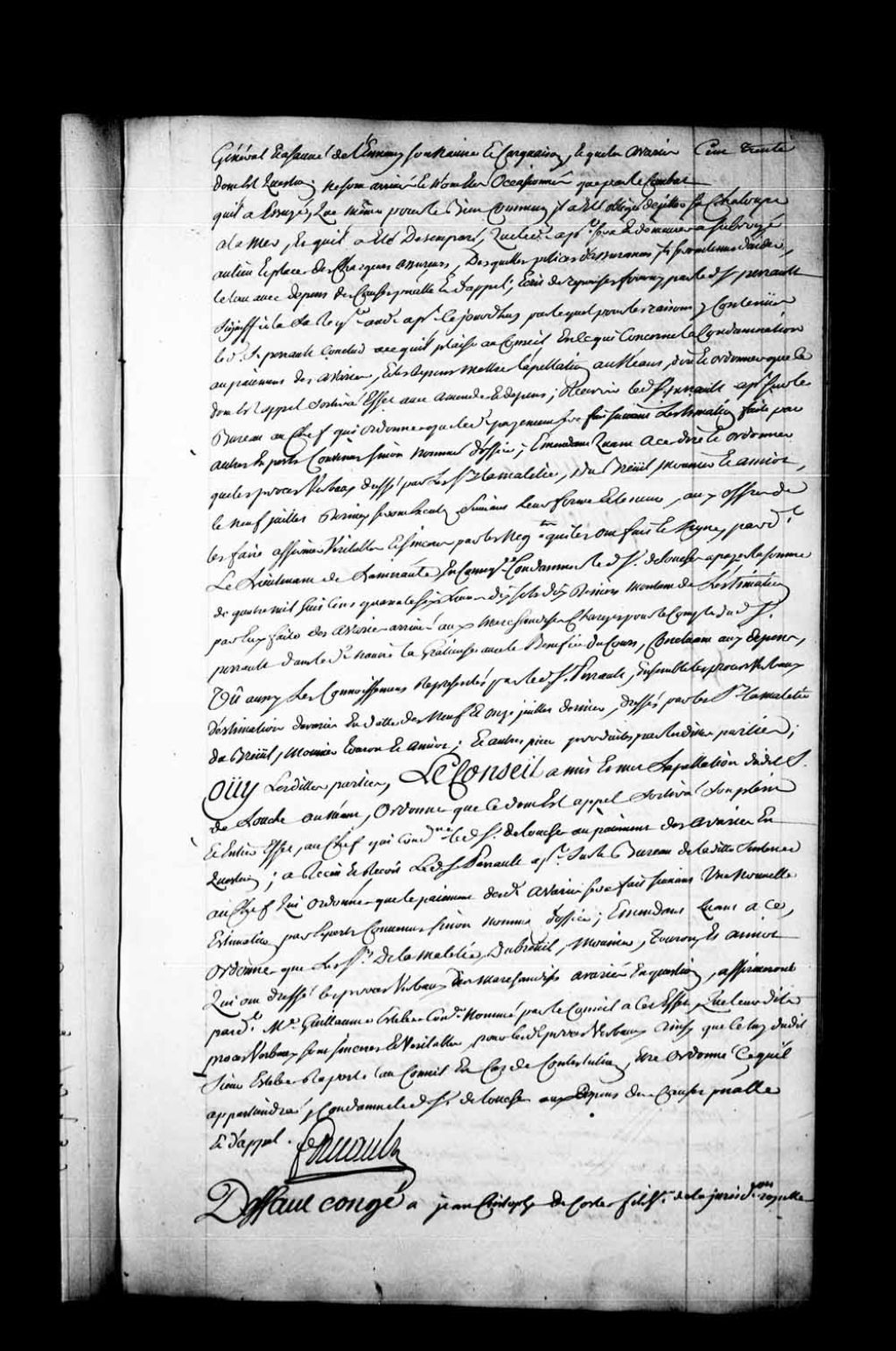 Arrêt qui accorde défaut-congé à Christophe deCoste, fils, huissier en la Juridiction de Montréal, contre Jean-Baptiste deCoste, père, huissier audiencier en la même Juridiction, 8 août 1757, Archives nationales à Québec, Fonds Conseil souverain, (03Q,TP1,S28,P21360).