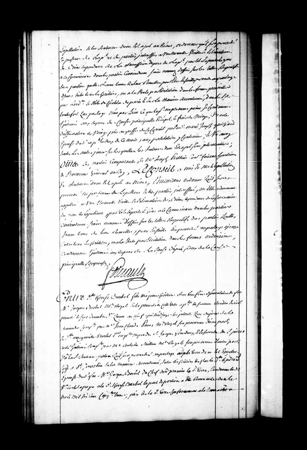 Appel mis à néant de la sentence rendue en la Prévôté de Québec, le 7 décembre 1758, dans la cause entre damoiselle Thérèse Barbel, fille majeure et héritière sous bénéfice d'inventaire de feu maître Jacques Barbel, notaire royal, représentée par maître Jean-Claude Panet, notaire royal, son procureur, contre demoiselle Marguerite Barbel, veuve en premières noces du sieur Jacques Gourdeau et, en secondes, du sieur Pierre Côté (Costé), représentée par maître Antoine Saillant, notaire royal, son procureur. Thérèse Barbel est condamnée à l'amende de 3 livres pour son «fol appel» et aux dépens de la cause d'appel