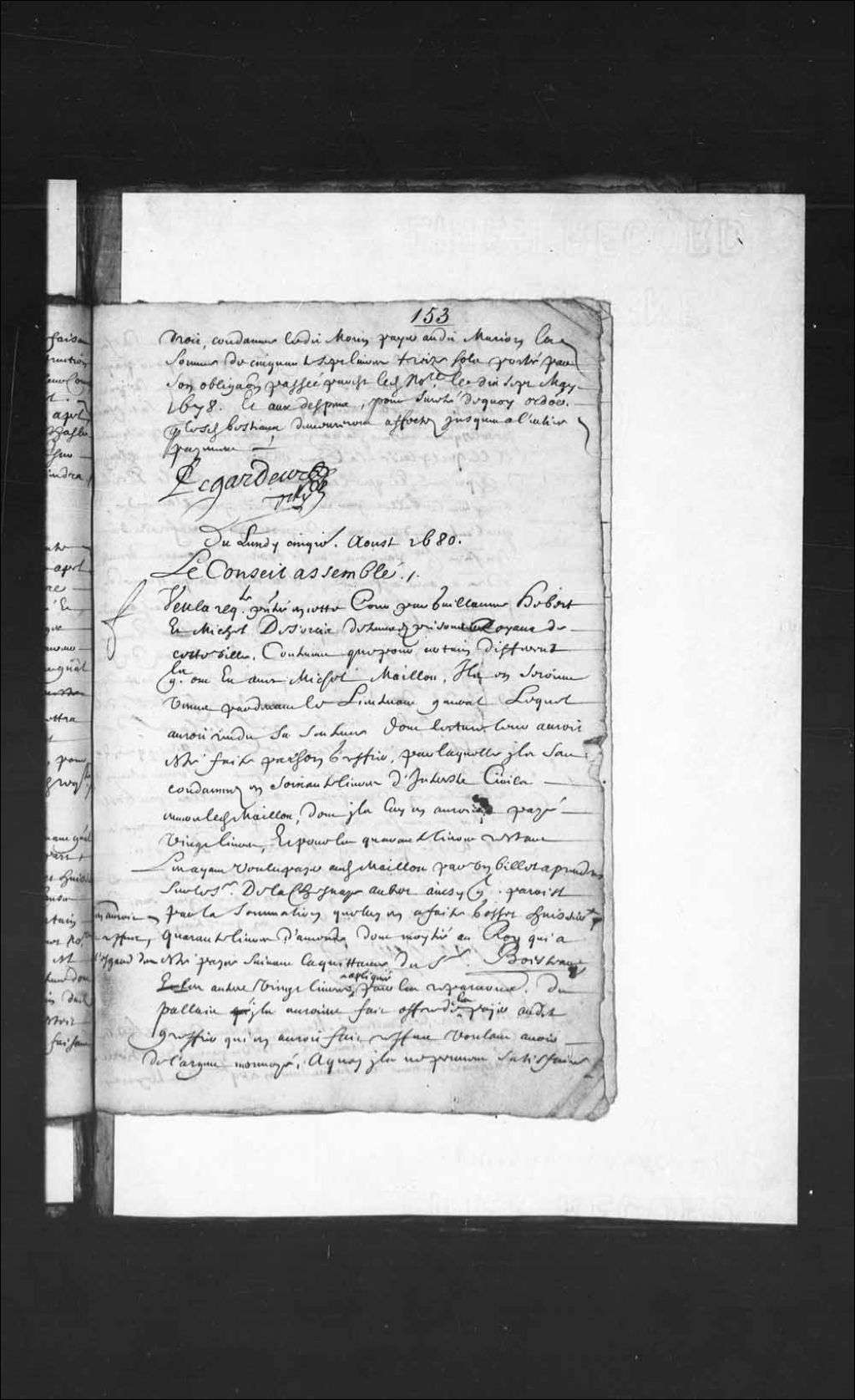 - Transcription du texte avec orthographe modernisée : «Du lundi cinquième août 1680. Le Conseil assemblé. Vu la requête présentée en cette Cour par Guillaume Hébert et Michel Desorcis détenus des prisons royaux de cette ville, contenant que pour certain différent qu'ils ont eu avec Michel Maillou (Mailloux), Ils en seraient venus par-devant le lieutenant général lequel aurait rendu sa sentence dont lecture leur aurait été faite par son greffier, par laquelle ils sont condamnés en soixante livres d'intérêts civils envers ledit Maillou, dont ils lui en auraient payé vingt livres, et pour les quarante livres restant les ayant voulu payer audit Maillou par un billet à prendre sur le sieur de Lachesnaie Aubert ainsi qu'il paraît par la sommation que lui en a faite Gosset huissier, il en aurait fait refus, et à l'égard des quarante livres d'amende dont moitié au Roi qui a été payée suivant la quittance du sieur Boesteau, et les autres vingt livres appliquées pour les réparations du palais qu'ils auraient fait offre de les payer audit greffier qui en aurait fait refus voulant avoir de l'argent monnayé, à quoi ils ne peuvent satisfaire n'en pouvant trouver, ayant été même contraints de faire emprunt du contenu aux billets qu'ils offrent pour payement, et que pour les frais de justice ils demandent temps de pourvoir et apporter ordre à leurs affaires afin d'y satisfaire, pour lesquels même ils ne peuvent être détenus prisonniers, à ce qu'il plaise à la Cour ordonner qu'ils seront élargis desdites prisons, et que ledit greffier de la prévôté acceptera le billet par eux produit pour l'amende, et que l'autre lui demeurera en dépôt pour les frais de justice qu'ils payeront aussi tôt qu'ils pourront donner ordre à leurs affaires, vu aussi la quittance du payement de la somme de vingt livres pour ladite amende envers sa Majesté sur la réponse du sieur Rouvré en date du 23e juillet dernier deux billets du Frère Joseph Boursier de la compagnie de Jésus en date des 29 et 30e dudit mois tirés sur le sieur de Lachesnaie Aubert pour le payement de la somme de quarante livres pour Guillaume LeConte, ainsi que de celle de vingt livres pour le même. sommation faite à la requête des exposant audit Maillou par Gosset huissier suivant son exploit du premier de ce mois dit a été que lesdits Hébert et Desorcis seront incessamment élargis, attendu les travaux pressant de la saison, à la charge par eux de faire valoir bons les billets en question. LEGARDEUR DE TILLY.»