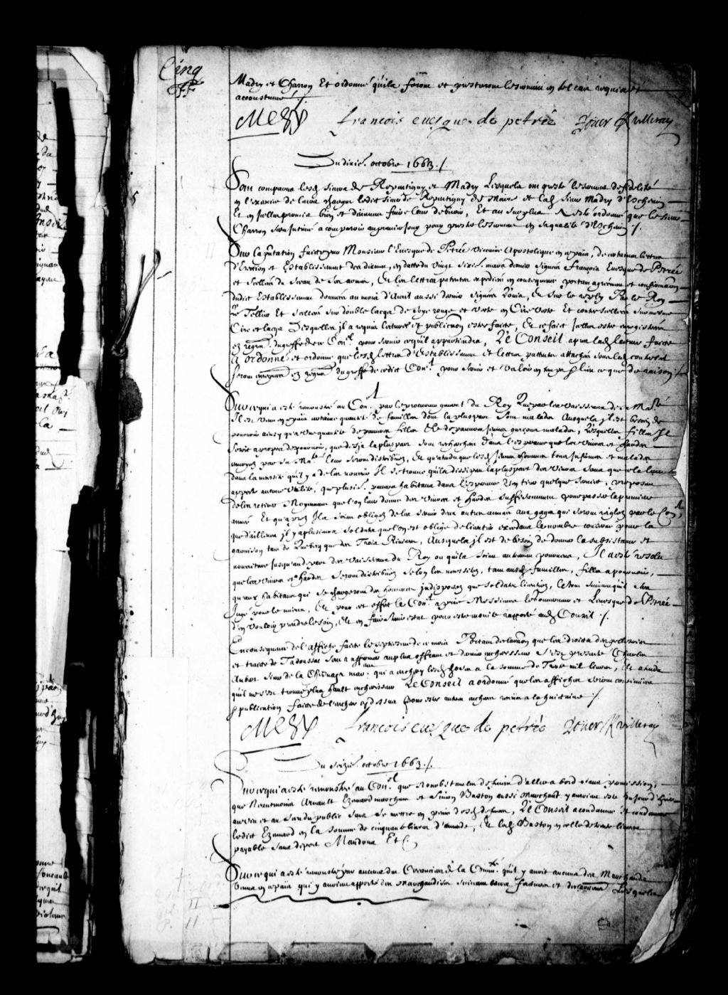 Arrêt ordonnant l'enregistrement au greffe du Conseil des «Lettres d'Erection et Etablissement des dîmes», en date du 26 mars 1663, présenté par Monsieur l'Évêque de Petrée, vicaire Apostolique et les Lettres patentes expédiées en conséquence par le Roi et données en avril 1663, 10 octobre 1663, Archives nationales à Québec, Fonds Conseil souverain, (03Q,TP1,S28,P24).