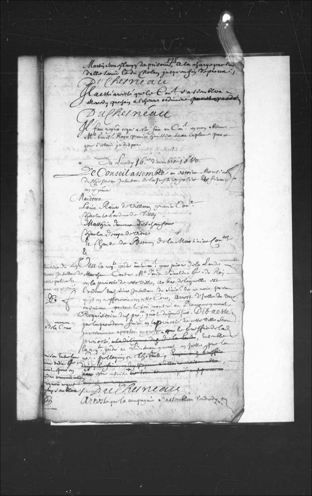 - Transcription du texte avec orthographe modernisée : «Du lundi 16e décembre 1680. Le Conseil assemblé où étaient Monsieur Duchesneau intendant de la justice police et finances en ce pays. Maîtres. Louis Rouer de Villeray premier conseiller. Charles Legardeur de Tilly. Mathieu Damours Deschaufour. Charles Denys de Vitré. Et Claude de Bermen de la Martinière conseillers Et. Vu la requête présentée à Monsieur Duchesneau intendant de la justice police et finances en ce pays par Pierre de LaLande marchand contre maître Louis Boulduc procureur du Roi en la prévôté de cette ville, au bas de laquelle est l'ordonnance dudit sieur intendant du sixième de ce mois portant qu'il en référerait en cette Cour, arrêt d'icelle du onzième ensuivant portant le soit montré au procureur général, réquisitoire dudit procureur général du jourd'hier. Dit a été que les procédures faites en la prévôté de cette ville seront incessamment apportées au greffe de la Cour par le greffier de ladite prévôté, ensemble la requête présentée au lieutenant général en icelle par les nommés pelloquin et Thibault remises entre les mains dudit procureur général pour en prendre communication et requérir ce que bon lui semblera. DUCHESNEAU.»