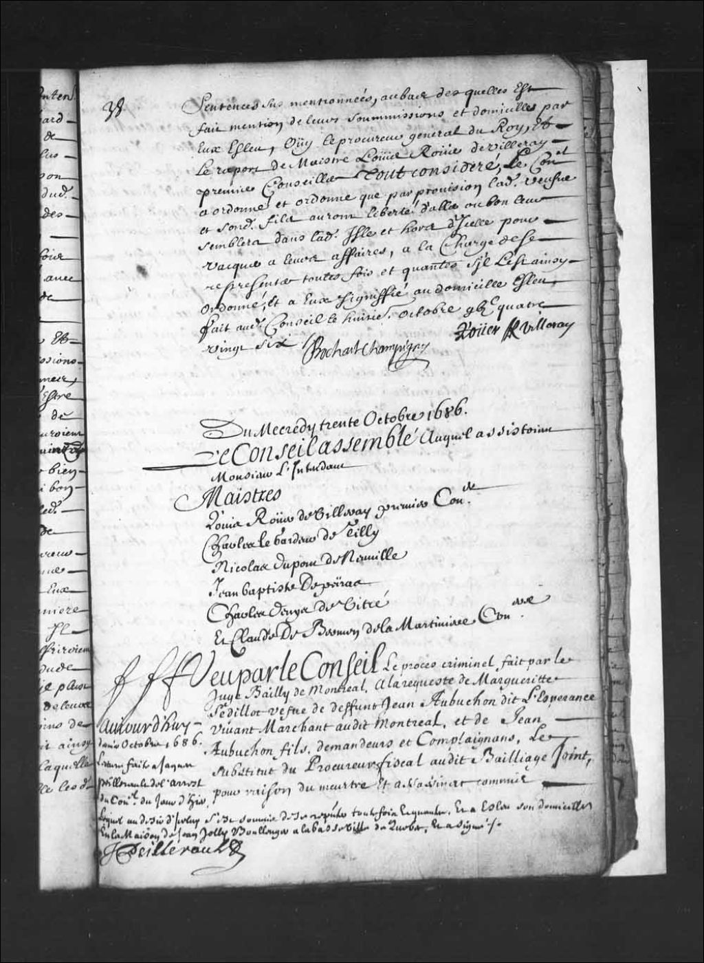 - Transcription du texte avec orthographe modernisée : «Du mercredi trente octobre 1686. Le Conseil assemblé auquel assistaient Monsieur l'intendant Maîtres Louis Rouer de Villeray premier conseiller. Charles LeGardeur de Tilly. Nicolas Dupont de Neuville. Jean-Baptiste Depeiras. Charles Denys de Vitré. Et Claude de Bermen de la Martinière conseillers. Aujourd'hui dernier octobre 1686. Lecture faite à Jacques Peillerault (Pillereau) de l'arrêt du Conseil du jourd'hier, lequel au désir d'icelui s'est soumis de se représenter toutefois et quantes, et a élu son domicile en la maison de Jean Jolly (Joly) boulanger à la basse-ville de Québec, et a signé J PEILLERAULT (Pillereau). Vu par le Conseil le procès criminel fait par le juge bailli de Montréal, à la requête de Marguerite Sedillot veuve de défunt Jean Aubuchon dit L'Espérance (Lespérance) vivant marchand audit Montréal et de Jean Aubuchon fils, demandeurs et complaignants, le substitut du procureur fiscal audit bailliage joint, pour raison du meurtre et assassinat commis nuitamment en la personne dudit défunt Lespérance trouvé mort en son lit et maison de Ville-Marie contre ceux qui se trouveront coupables dudit meurtre; et encore lesdits Marguerite Sedillot veuve et Jean Aubuchon fils appelant de sentences dudit juge bailli, à l'encontre d'eux rendue chacun à leur égard le dix-neuf avril dernier, sentence dudit bailli du quinzième mai dernier, par laquelle il est dit que pour plus amplement savoir par la bouche de Jacques Peillerault habitant de ladite île de Montréal défendeur et accuse prisonnier en la conciergerie de cette ville, la vérité des crimes à lui imputés, il serait appliqué à la question ordinaire et extraordinaire, et interrogé sur les faits résultant dudit procès; à la prononciation de laquelle sentence ledit Peillerault s'en serait porté appelant audit Conseil; extrait des registres de la geôle de ladite conciergerie, portant l'écrou dudit accuse par l'huissier Roger du dix-neuvième dudit mois de mai, procès-verbal dudit bailli du quatre juin signé Bourgine greffier, contenant la déclaration de l'une des voisines dudit accusé, requête dudit Aubuchon fils, et addition d'information faite en conséquence par ledit Bailli les cinq et six dudit mois, enfin de laquelle est le réquisitoire dudit substitut, et l'ordonnance dudit bailli du septième du même mois portant que ladite addition et certain justaucorps, seraient incessamment envoyés au procureur général du Roi audit Conseil; autre procès-verbal dudit Bailli du sixième dudit mois, contenant perquisition et recherche de hardes et meubles trouvés en la maison dudit accusé située en la côte Saint-François en ladite île, auquel lieu ledit justaucorps aurait été trouvé, autre addition d'information faite par ledit Bailli le seizième septembre dernier; vu aussi lesdites deux sentences du dix-neuvième avril dernier, ledit substitut du procureur fiscal joint à ladite Sedillot et sondit fils, et incidemment accusateur dans la suite de la procédure criminelle contre ladite Sedillot (Sédilot) et son fils, lesdites sentences portant qu'il serait plus amplement informé à l'encontre d'eux des cas mentionnés audit procès, et cependant qu'ils seraient élargis à leur caution de se représenter toutefois et quantes qu'il serait ordonné, avec défenses à eux de désemparer de ladite île à peine de conviction, élisant domicile à cet effet; à la prononciation desquelles sentences ladite veuve et sondit fils y auraient acquiescé, élu domicile et fait les soumissions requises pour avoir provision de leurs personnes. Arrêt dudit Conseil du vingt-cinquième dudit mois de mai dernier, par lequel maître Nicolas Dupont conseiller en icelui aurait été commis pour interroger ledit Peillerault. Interrogatoire dudit accusé des premier et vingt-deuxième dudit mois de juin. Arrêt du quinzième juillet ensuivant, par lequel maître Louis Rouer de Villeray premier conseiller aurait été commis pour avec ledit sieur Dupont voir et examiner les procédures et tout ce qui s'en est ensuivi, autre arrêt dudit Conseil du huitième du présent mois rendu sur requête de ladite Sedillot et sondit fils, par lequel et pour les causes y contenues aurait été ordonné que par provision Ils auraient liberté d'aller ou bon leur semblerait dans ladite île de Montréal et hors d'icelle pour vaquer à leurs affaires, à la charge de se représenter toutefois et quantes qu'il le serait ainsi ordonné et à eux signifié au domicile par eux élu, autre arrêt dudit jour portant entre autres choses qu'avant faire droit sur l'appel dudit Peillerault, les nommés Jacques et Jean Mesnard (Ménard) père et fils habitants de Boucherville, Pierre Perthuis et Marguerite juillet femme de Urbain Baudreau dit Graveline habitant dudit Montréal témoins ouïs les informations et additions seraient récolés en leurs dépositions, et si besoin était confrontés audit Peillerault, et cependant qu'il serait derechef interrogé sur aucuns faits résultant du procès, interrogatoire dudit accusé du vingt-deuxième dudit présent mois d'octobre, exploit du seizième signé Cabazié, portant assignation auxdits Jacques Mesnard et Perthuis et femme dudit Baudreau aux fins dudit arrêt du huitième pour être récolés en leurs dépositions, et confrontés audit Peilleraud, ledit Jean Mesnard n'ayant été assigné, étant parti pour le voyage de Catarakoui, récolement et confrontation desdits témoins du vingt-troisième de ce dit mois, interrogatoire dudit Peillerault accusé mandé à la chambre; conclusions du procureur général du Roi de ce jour, requête de ladite Marguerite Sedillot et sondit fils, à ce qu'en procédant au jugement de l'appel dudit Peillerault, et vu les procédures contre eux faites, Ils fussent renvoyés absous à pur et à plein des accusations contre eux faites. étant innocents et sans aucune Coulpe du meurtre 